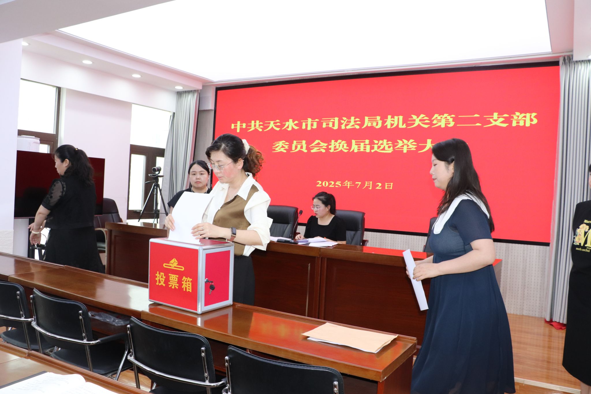 为进一步加强基层党组织建设,依据《中国共产党章程》《中国共产党基层组织选举工作条例》等规定,7 月 1 日至 7 月 2 日,天水市司法局机关第一、第二党支部召开换届选举大会,顺利完成换届选举工作,选举产生新一届党支部班子。