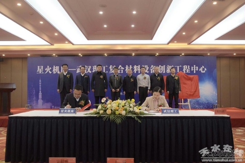 揭牌仪式上,星火机床公司和武汉理工大学签订了关于联合组建成立“星火机床—武汉理工复合材料设备创新工程中心”协议书。