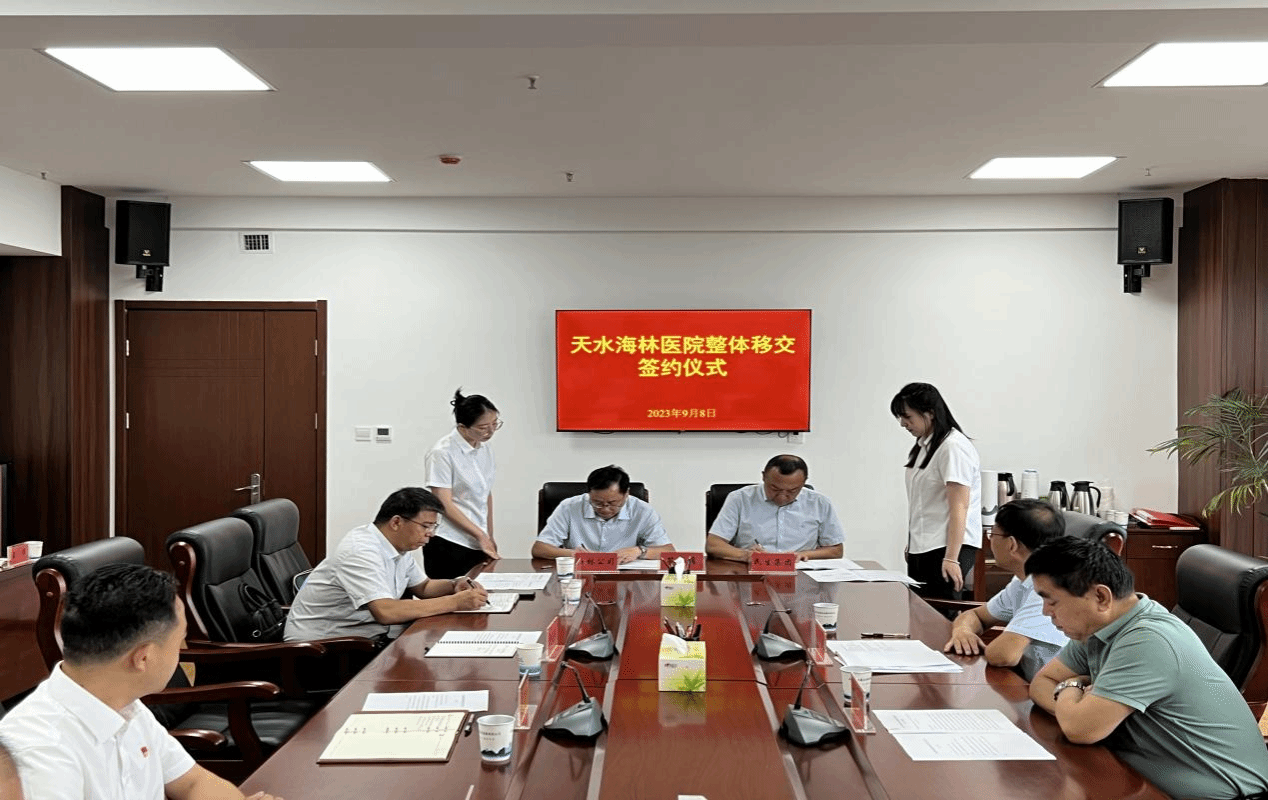9月8日上午,天水海林医院整体移交签约仪式在市政府国资委举行。天水海林轴承有限责任公司董事长何克鸿、天水民生发展集团有限公司董事长李子东代表交接双方在移交协议上签字。市政府国资委党委委员、副主任杨建成主持签约仪式。