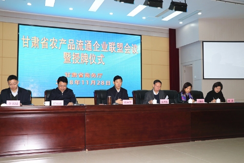 11月28日,甘肃省商务厅召开全省农产品流通企业联盟会议并举行授牌仪式,厅党组书记、厅长张应华作重要讲话,厅党组成员、副厅长任福康主持会议,厅领导张世恩、王颖玲、李书敏、刘萍参加会议并为2017年新增大市场、产地批发市场以及甘肃省农产品销售服务中心授牌,见证农产品流通企业联盟新增成员协议签订仪式。各市州商务局负责人、省商务厅有关处室负责人,以及企业联盟成员单位、甘肃省农产品销售服务中心和我省重点农产品流通企业代表与甘肃日报、省广电总台新闻中心、国际商报等新闻单位约100多人参加了会议。