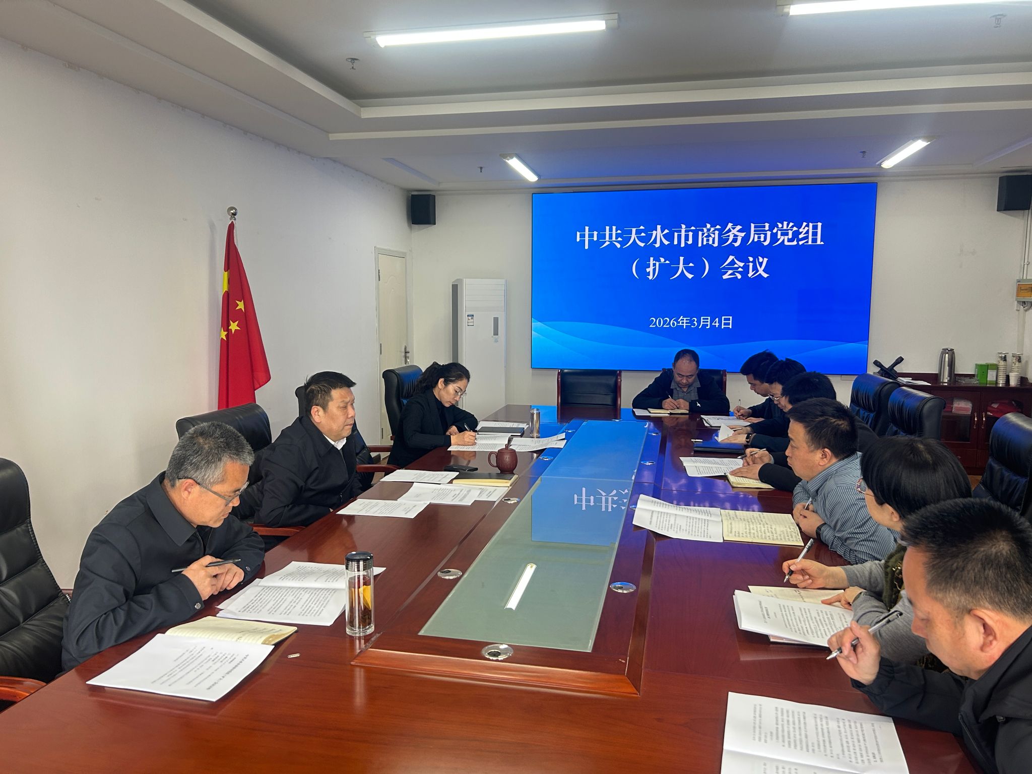 3月4日,天水市商务局召开党组(扩大)会议,深入学习贯彻习近平总书记关于树立和践行正确政绩观的重要论述,认真学习中央和省市委党的建设工作领导小组会议精神,审议《市商务局开展树立和践行正确政绩观学习教育工作方案》,安排部署全局学习教育工作。局领导班子成员、各科室负责人参加会议。