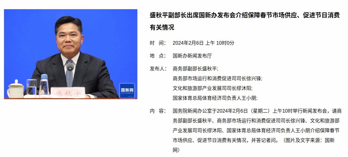 国务院新闻办新闻局副局长、新闻发言人寿小丽:女士们、先生们,大家上午好!欢迎出席国务院新闻办新闻发布会。今天我们非常高兴邀请到商务部副部长盛秋平先生,请他为大家介绍保障春节市场供应、促进节日消费有关情况,并回答大家关心的问题。出席今天新闻发布会的还有:商务部市场运行和消费促进司司长徐兴锋先生,文化和旅游部产业发展司司长缪沐阳先生,国家体育总局体育经济司负责人王小朋女士。