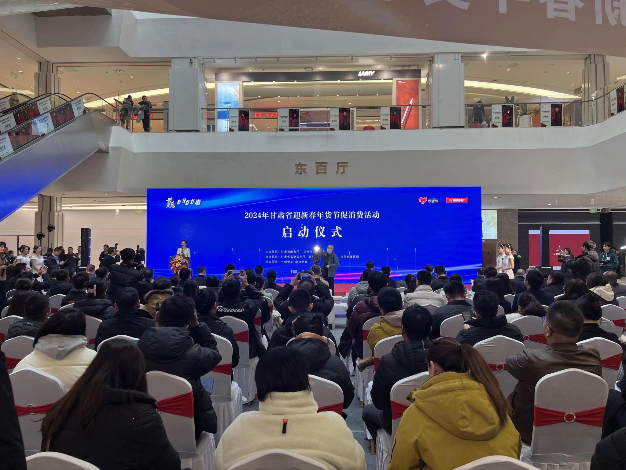 为深入贯彻省委经济工作会议精神,紧抓元旦春节消费旺季促销,巩固我省消费市场回暖向好态势,按照商务部“2024消费促进年”工作部署和全省商务工作会议总体安排,1月18日上午,2024年“甘肃省迎新春年货节”促消费活动启动。省委常委、副省长张锦刚出席并宣布活动启动,省商务厅党组书记、厅长杨小平致辞,兰州市委副书记、市长刘建勋发布兰州市迎新春年货节优惠政策。省农业农村厅、省文旅厅、省体育局有关负责同志与中石油甘肃销售公司、中国移动甘肃公司、甘肃苏宁易购、甘肃新媒体集团、甘肃供销集团和兰州中心等全省汽车、成品油、家电家居、移动通讯、商贸综合体、电商平台等龙头企业负责人,共约200人参加启动仪式。