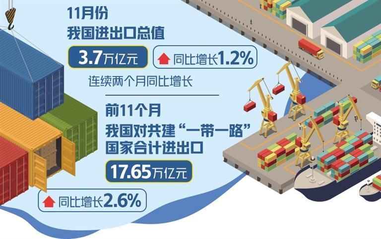 经济日报北京12月7日讯(记者冯其予)海关总署7日发布最新数据显示,今年前11个月,我国进出口总值37.96万亿元,与去年同期持平。其中,出口21.6万亿元,增长0.3%;进口16.36万亿元,下降0.5%。11月当月,我国进出口3.7万亿元,增长1.2%,保持了10月起单月增速正增长的态势。外贸进出口累计增速总体保持平稳,月度进出口向好态势进一步巩固。