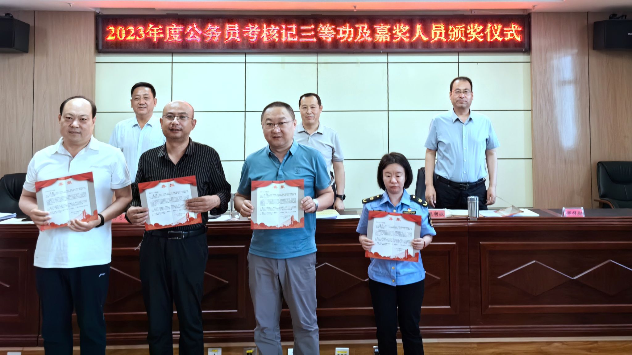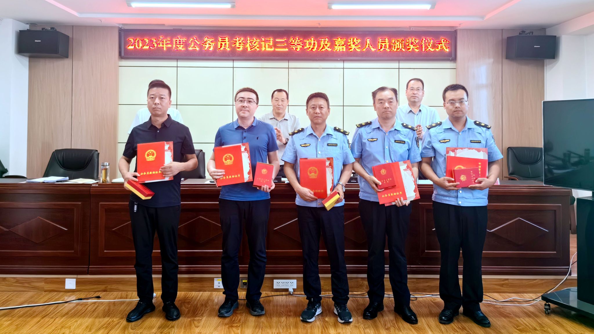 近日,市生态环境局举行了公务员记三等功、嘉奖颁奖仪式,由市生态环境局班子成员为局机关及执法队2023年度5名记三等功公务员和7名获得嘉奖公务员颁发证书及喜报。