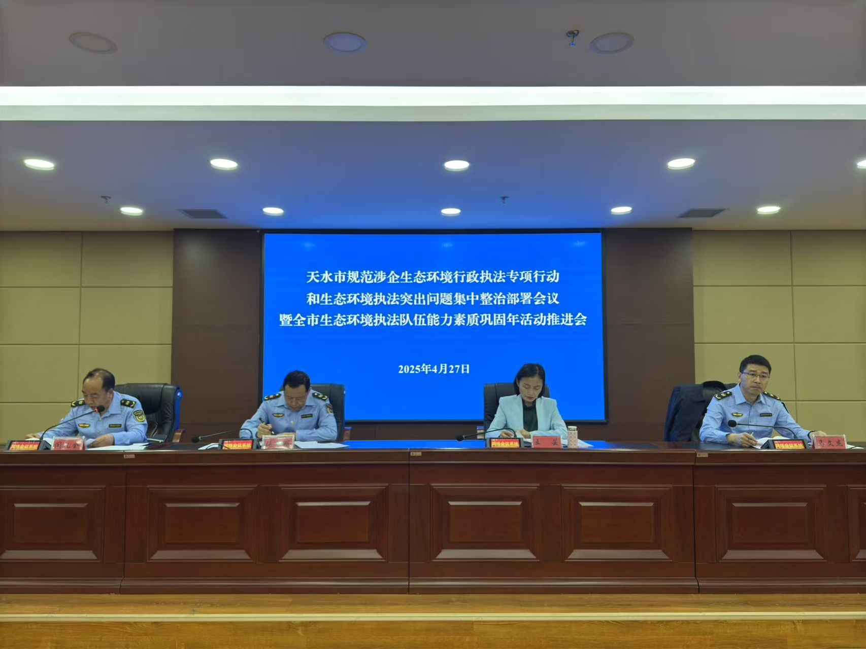 4月27日上午,天水市生态环境局召开规范涉企生态环境行政执法专项行动和生态环境执法突出问题集中整治部署会议暨全市生态环境执法队伍能力素质巩固年活动推进会议。会上宣读了《天水市规范涉企生态环境行政执法专项行动实施方案》和《天水市生态环境执法突出问题集中整治工作方案》,通报了2024年全市生态环境保护综合行政执法队伍能力素质提升年活动情况,局主要领导对规范涉企生态环境行政执法专项行动和生态环境执法突出问题集中整治工作以及对深入开展全市生态环境执法队伍能力素质巩固年活动进行了安排部署。