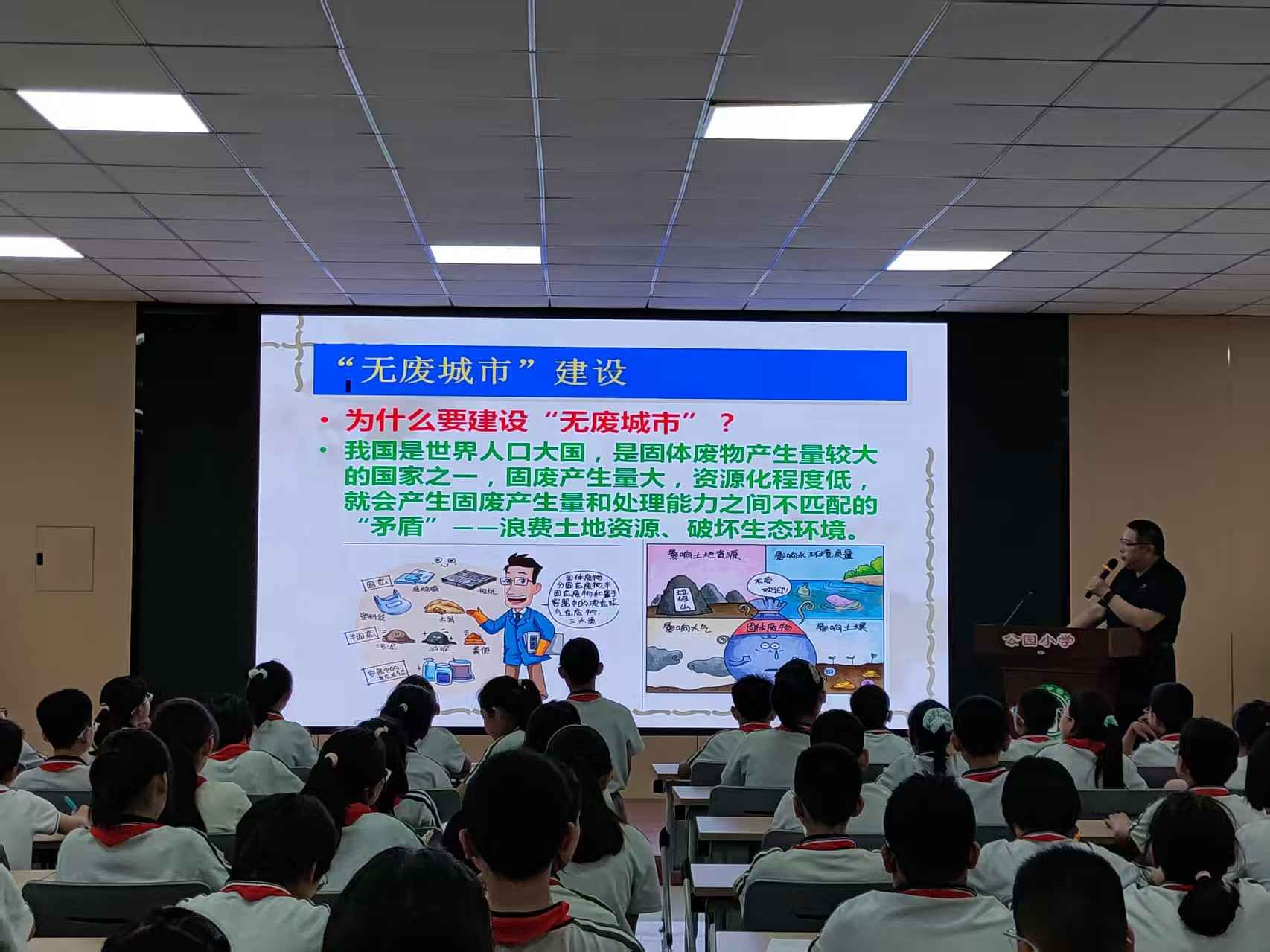 活动现场,以“共享绿色生活”为主旨,土壤环境科科长李彦泉通过趣味的动画、数据图表生动阐述了“无废城市”的内涵,立足从身边做起,列举贴近生活的垃圾再生利用等案例,深入浅出地讲解了固体废物的源头、如何减量及正确分类处理及资源化利用的重要意义,引导学生树立“垃圾就是放错地方的资源”理念,在讲座中还穿插了环保知识竞答环节,同学们争相举手,现场气氛活泼热烈。