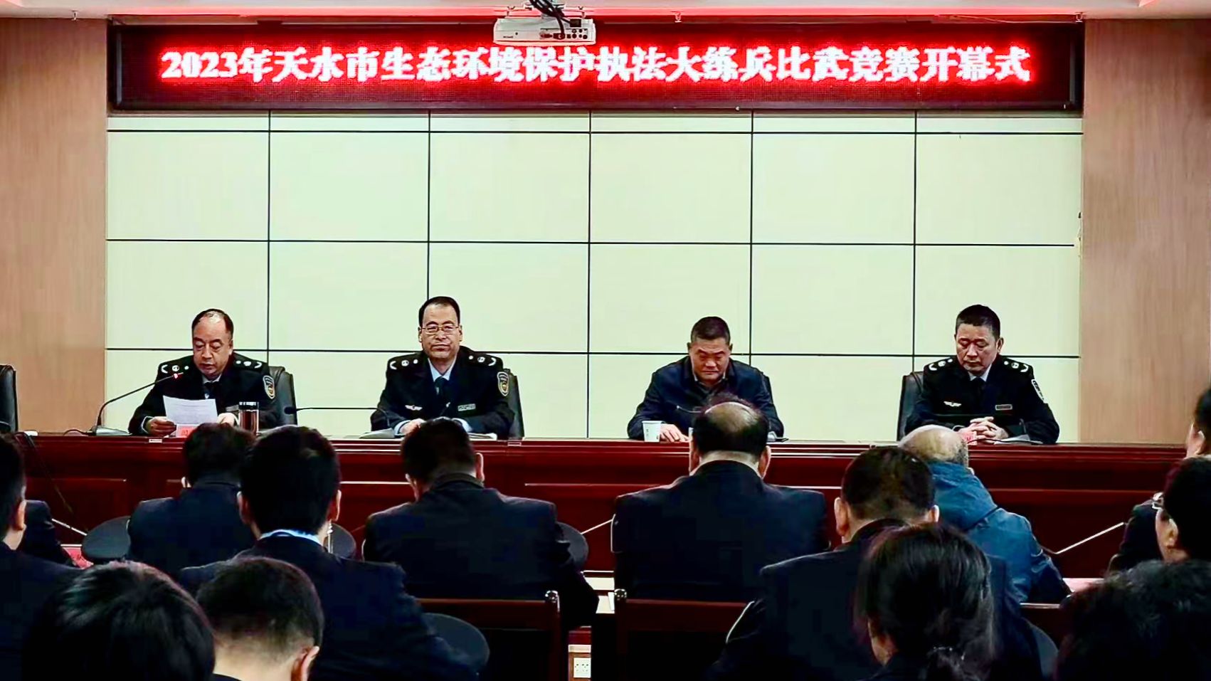近年来,天水市生态环境局在执法队伍建设方面持续用力,先后开展执法队伍作风能力专项整治、执法队伍“四查四看”行动,改进工作作风,提高工作执行力;为全体执法人员统一配发制式服装,开展常态化队列训练,争取资金配备执法车辆,积极推进执法机构规范化示范创建,建立健全各项执法制度,强化移动执法使用,不断优化执法方式,提升监管服务水平;先后开展生态环境问题排查整治、水源地环境保护专项行动、入河排污口排查整治、“两打”及第三方环保服务机构专项整治等各类专项执法检查,严查环境违法行为,加大执法力度,解决环境问题;每年组织开展执法大练兵活动,开展案卷评查、执法稽查、交叉执法,举办比武竞赛实战练兵,积极选派执法骨干参加生态环境部和省厅专项监督帮扶、全省执法比武竞赛,锻炼能力本领,提升执法效能,全市生态环境执法工作取得了一定成效。