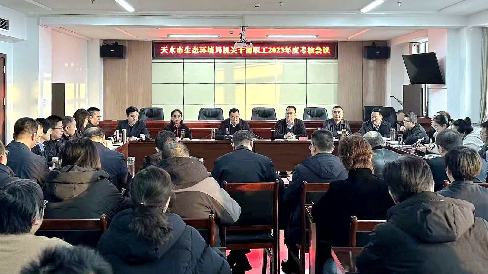 为全面总结回顾一年来市局机关干部职工思想、学习、工作、纪律情况,客观公正的评判过去一年的工作实绩和现实表现,进一步激发全系统干事创业的积极性。1月26日上午,市生态环境局召开机关干部职工2023年度考核会议,局班子成员及机关干部职工共48人参加考核会议。