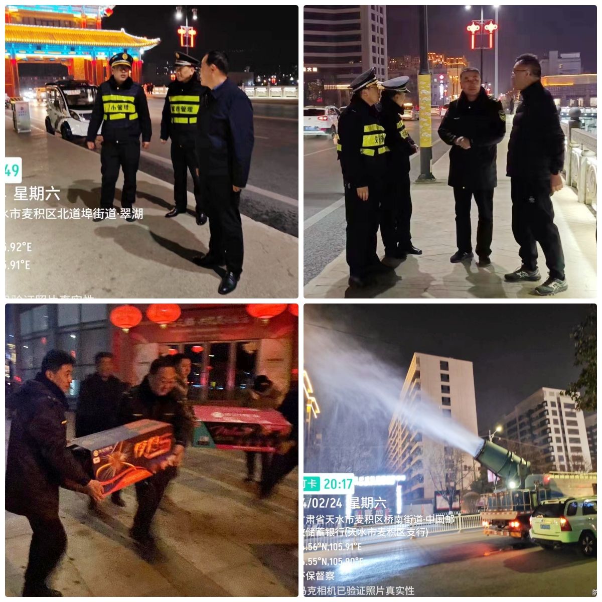 联防联控强监管。市生态环境局抽调24名执法人员由班子成员带队下沉县区蹲点包抓,加强重点县区管控力量;秦州、麦积两区抽调区公安、应急、城市管理、生态环境等部门执法人员近300余人参加元宵节联合管控专项行动,通过统筹安排,分9大组45小组对两区9个易集中燃放点蹲守盯防、对其周边重点区域进行全方位巡查管控;五县也各自按管控方案要求开展禁燃限放管控工作,确保元宵节庆祝期间不出现人为因素导致污染天气出现。此外,各县区环卫部门全力配合,通过雾炮抑尘、湿法清扫等措施,对非禁放区域燃放烟花爆竹产生的污染物进行消减和清理。