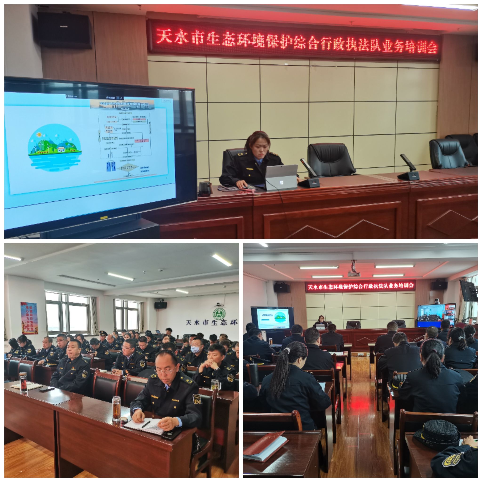 4月30日,组织开展全市生态环境行政处罚案卷办理程序及要点业务培训暨生态环境执法系统队列训练,市生态环境保护综合行政执法队80余名执法人员参加活动,五县分局均设分会场,组织全体执法人员参加了线上培训并开展常态化队列训练。