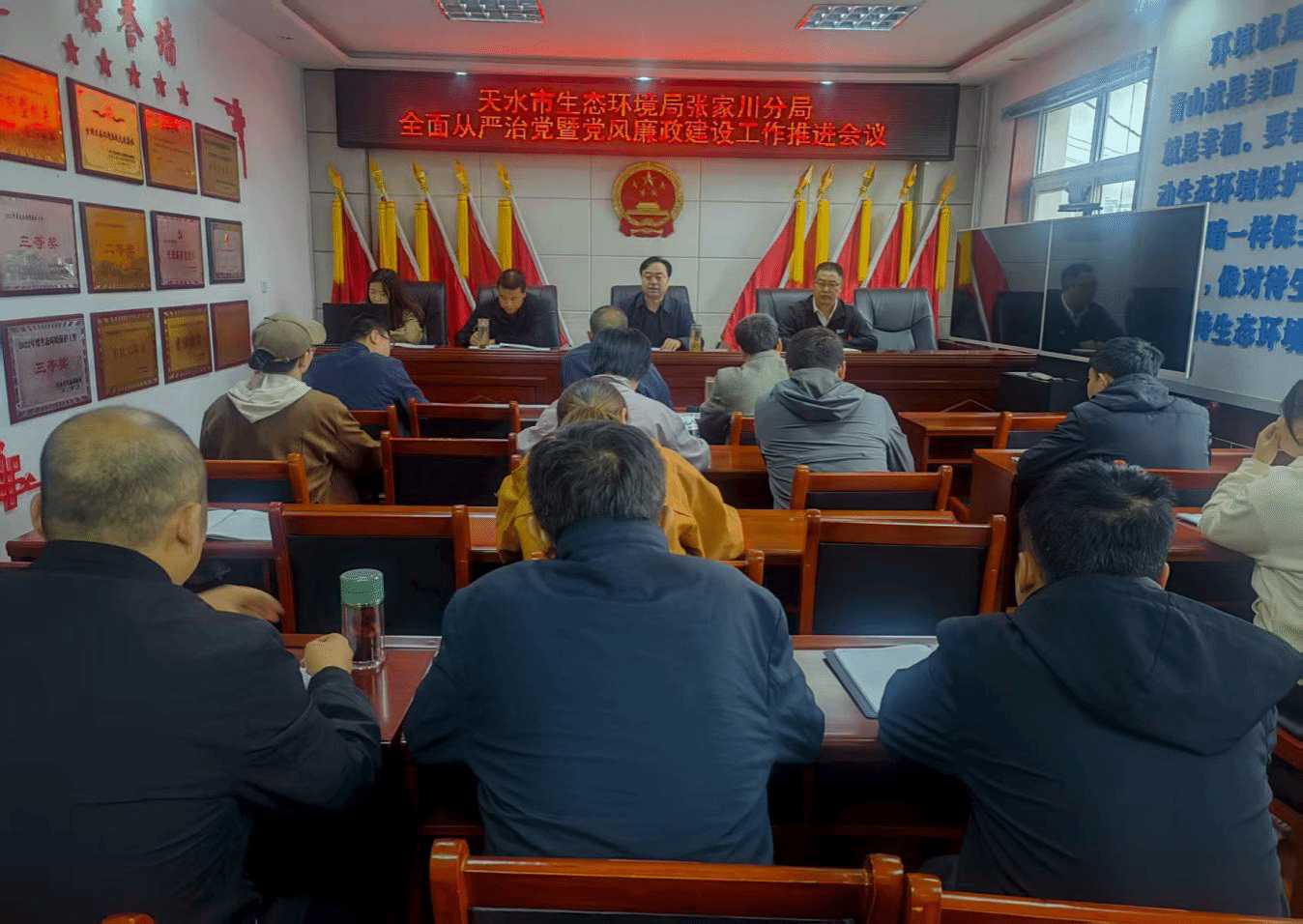 9月18日,天水市生态环境局张家川分局召开全面从严治党暨党风廉政建设工作推进会,传达学习了习近平总书记关于全面从严治党的重要论述、6月30日中共中央政治局第二十一次集体学习会议精神和中央、省市县委党的建设工作领导小组会议精神,总结上半年全面从严治党工作,分析当前形势,对下半年工作进行安排部署,会上组织全体干部职工观看了警示教育片。局党组书记、局长马晖主持并讲话,全体干部职工参加会议。