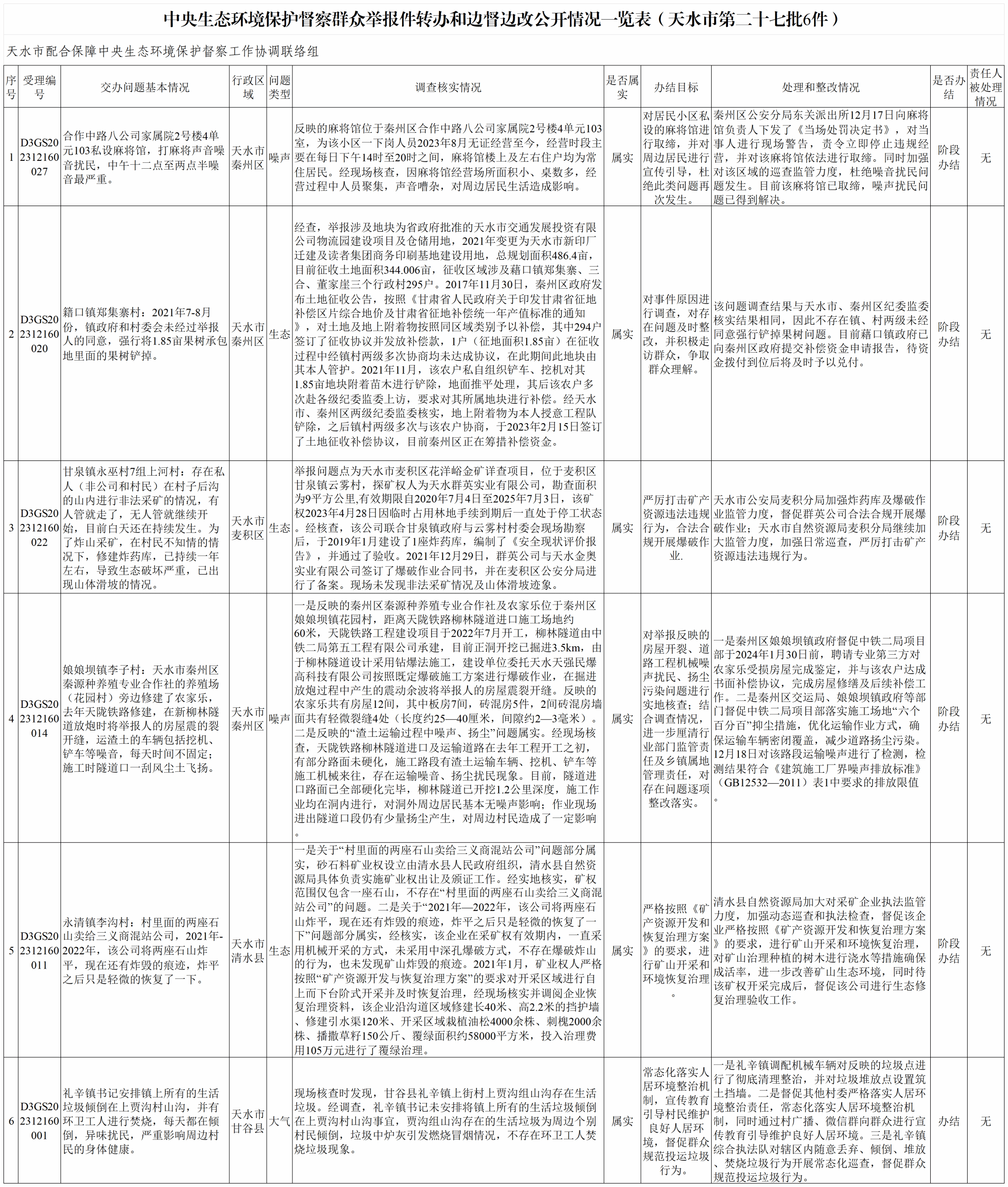 2023年12月18日,我市接到中央第四生态环境保护督察组交办的第二十八批群众举报件10件(一般件8件,重点件2件),其中秦州区1件、麦积区4件、秦安县1件、甘谷县1件、武山县1件、张家川县2件;群众举报反映问题涉及水污染1件、土壤污染5件、生态破坏3件、噪声污染1件。现将具体办理情况公示如下。