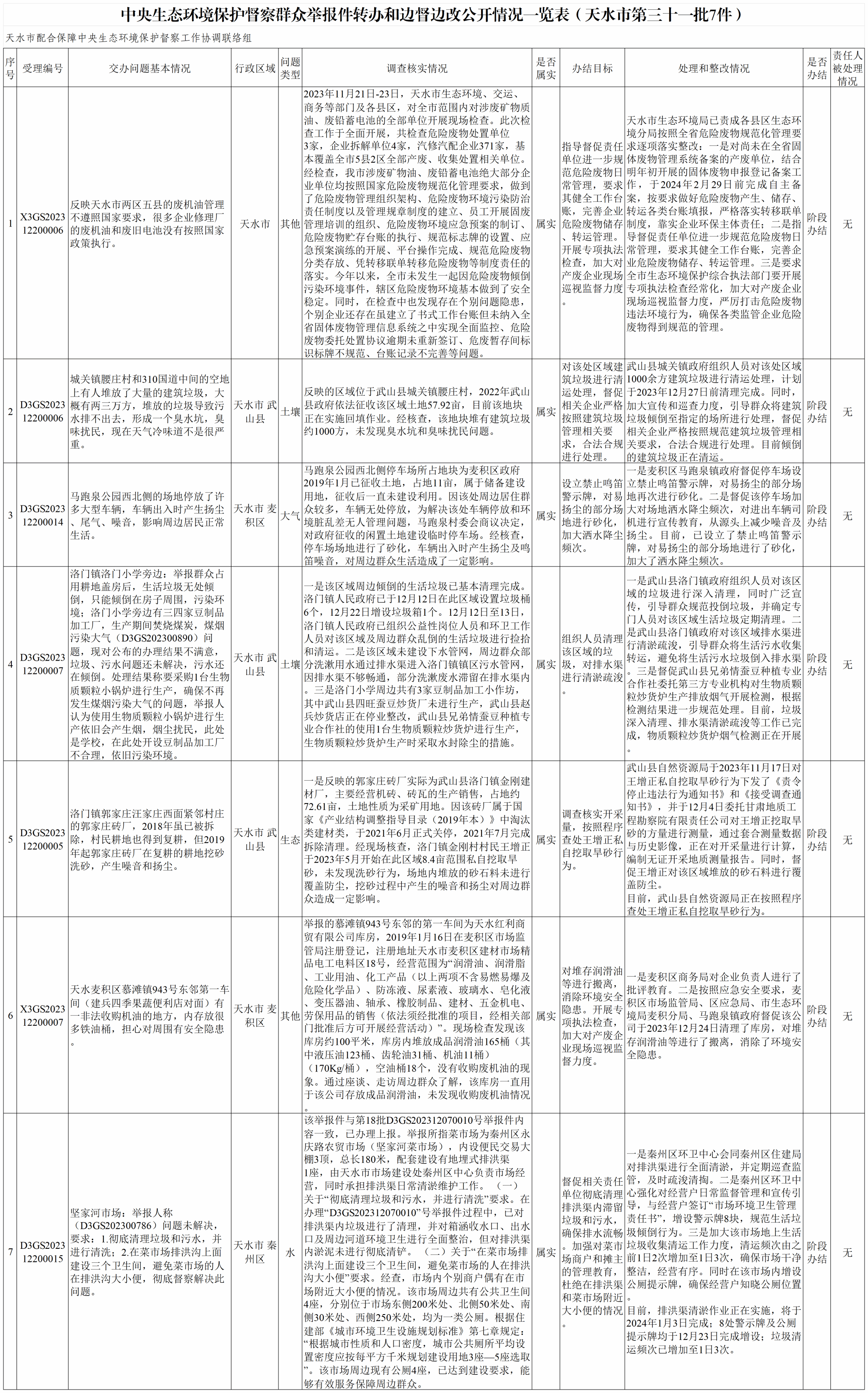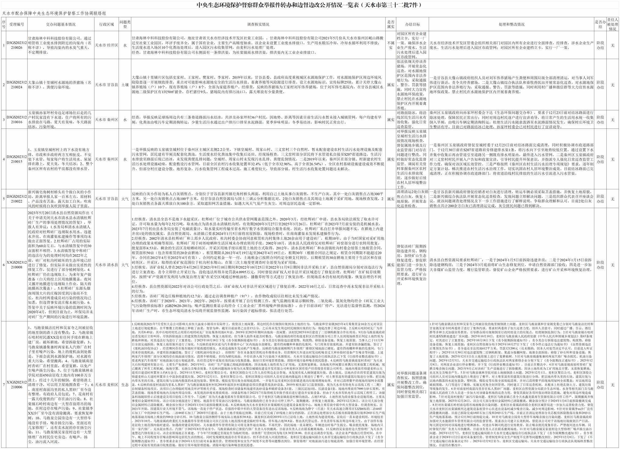 2023年12月22日,我市接到中央第四生态环境保护督察组交办的第三十二批群众举报件7件(一般件5件,重点件2件),其中秦州区2件、麦积区1件、甘谷县2件、清水县1件、经开区1件;群众举报反映问题涉及大气污染2件、水污染3件、土壤污染1件、生态破坏1件。现将具体办理情况公示如下。