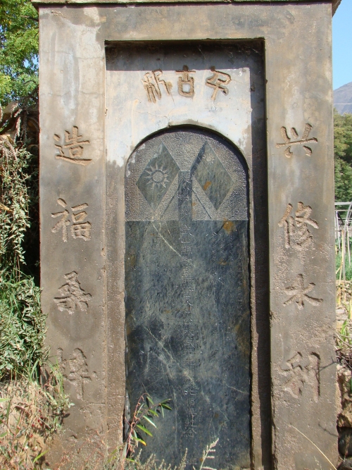 在武山县山丹镇渭河村村西马路边,矗立着一块“新修水利、造福桑梓”的石碑,石碑高140厘米、宽54厘,碑文为竖行。石碑正中刻有四个小篆字“渭水流芳”及武山县劝学所所长车公敬武先生创开北顺渠(车岸渠)纪念。右侧:“赞曰:伟矣车君、痿卧二十、百事纪里、续然井然,诚能动众毅任坚,缒石架险,引渭灌田,化硗为沃,以人补天、云连绮错,南北蜿蜒、为国家加强生产力,为地方开利、赖之源泉,呜呼!志为气帅,人贯神全,卓卓者,夔芸者、蚿惟贞,固足以干事、吾谓:车君其庶几焉”九十七个字,碑面左侧:授业固纯德沐手谨录、授业刘秉仁鞠躬敬书及北顺渠众户供105户署名。落款:中华民国三十二年二月十九日。