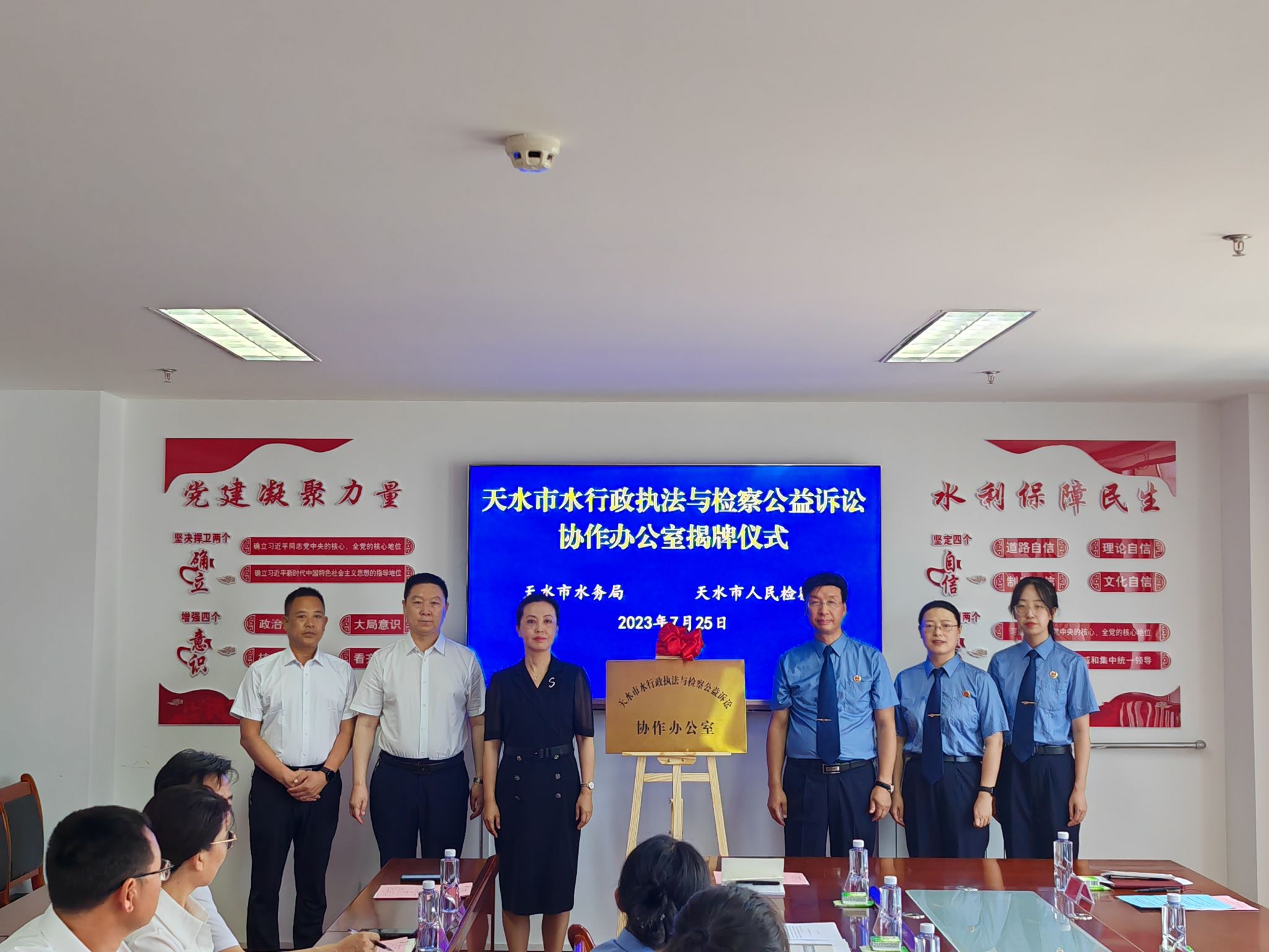 7月25日下午,市水务局党组书记、局长刘云同志和市人民检察院党组成员、副检察长张国仓同志共同为“天水市水行政执法与检察公益诉讼协作办公室”揭牌。协作办公室的成立,标志着我市检察部门和水务部门共同构建依法治水新模式已初步建立,水行政执法与检察公益诉讼协作工作进入了实质性阶段。