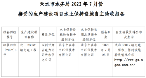 根据《水利部关于加强事中事后监管规范生产建设项目水土保持设施自主验收的通知(水保〔2017〕365号)、《甘肃省水利厅关于印发< 加强事中事后监管规范生产建设项目水土保持设施自主验收实施意见>的通知》(甘水水保发〔2017〕)381号)的有关规定,2022年7月份我局接受了1个生产建设项目水土保持设施自主验收报备。现将有关情况予以公告,公告期为2022年8月1日-2022年8月15日。
