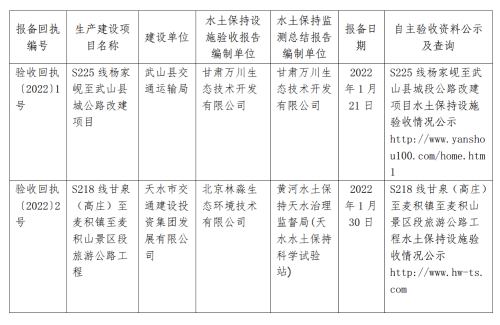 天水市水务局2022年1月份接受的生产建设项目水土保持设施自主验收报备