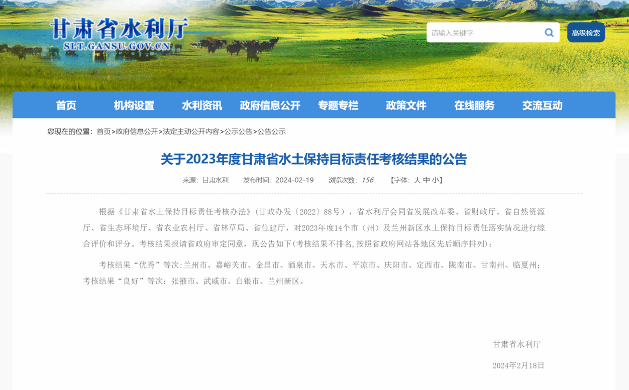 经省水利厅会同省发改委、省财政厅、省自然资源厅、省生态环境厅、省农业农村厅、省林草局、省住建厅,对2023年度全省水土保持目标责任落实情况综合考核,省政府同意,天水市再次获得全省水土保持目标管理考核优秀等次!这是继2021年以来连续3年获此殊荣!