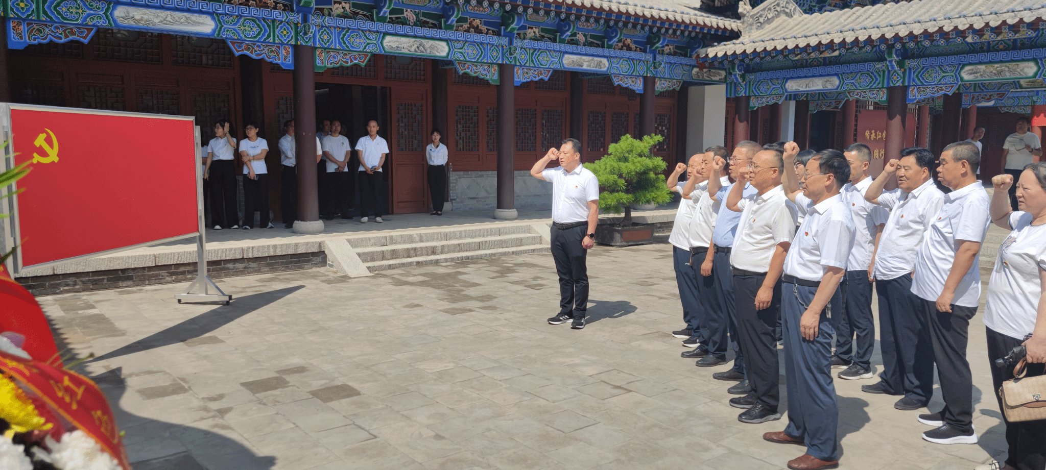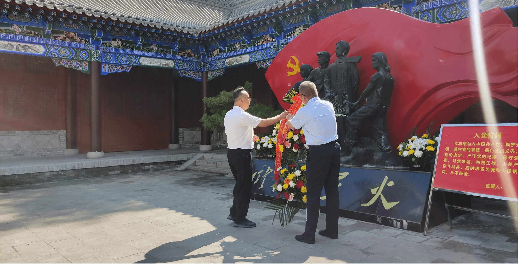 党员代表向革命先辈敬献花篮,表达了对革命先烈为了民族独立解放事业英勇奋斗和勇于献身壮举的敬意。全体党员面对党旗重温入党誓词,表达了对党忠诚、勇于传承红色基因、践行初心使命、为实现中华民族伟大复兴中国梦拼搏奉献的坚定决心。