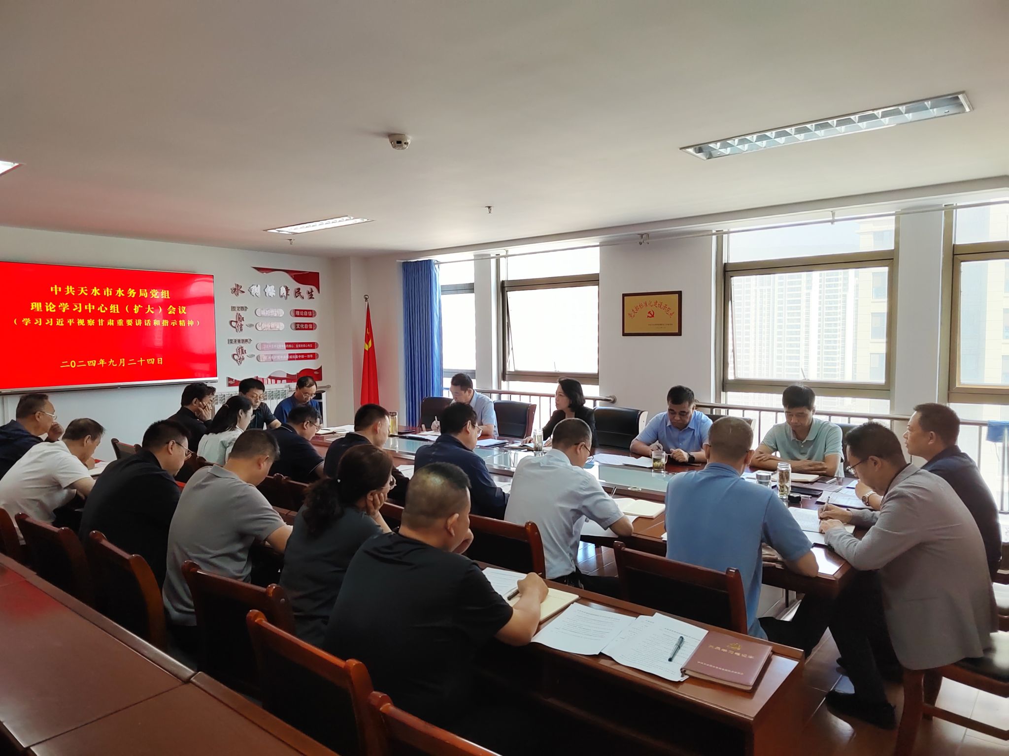 9月24日,市水务局召开党组理论学习中心组学习(扩大)会议,传达学习习近平总书记视察甘肃重要讲话重要指示精神、习近平总书记在全面推动黄河流域生态保护和高质量发展座谈会上的重要讲话精神,以及有关省、市委常委会会议精神,研究部署贯彻落实工作。市水务局班子成员、调研员,局机关各科室科长、局属各单位负责人参加会议。