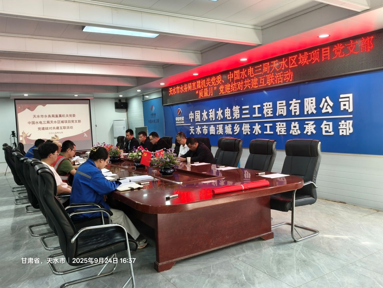 9月24日,天水市水务局直属机关党委与水电三局天水区域项目部党支部党建结对共建活动在项目部会议室隆重举行。市水务局机关党委、建管科、监督科、质量中心相关负责人及党员代表,水电三局曲溪城乡供水工程项目部支部领导、各部门负责人与党员代表共同参会,会议由支部委员、项目副经理何杰主持。