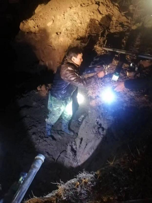 县恒华农村供水公司领导班子第一时间带领远门供水站全体职工,赶到现场后发现,供水主管破裂,自来水从开裂处源源不断的泄露出来,如果不及时维修,不仅会造成水资源浪费,更可能因故障扩大造成附近8个受益村停水的严重后果。他们冒着刺骨的寒风,借助机械灯光开展抢修工作。