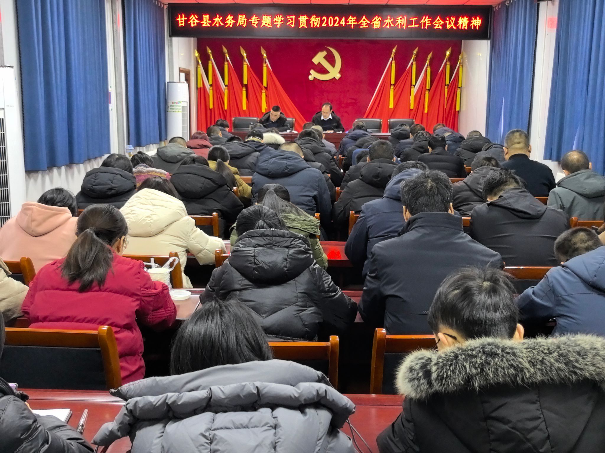 2024年2月5日,甘谷县水务局召开专题学习贯彻2024年全省水利工作会议,会议由局党组书记、局长王继福主持,局党组成员、科级领导干部、各供水站站长、机关全体干部职工共计60余人参加会议。会上,传达学习了2024年全省水利工作会议精神。