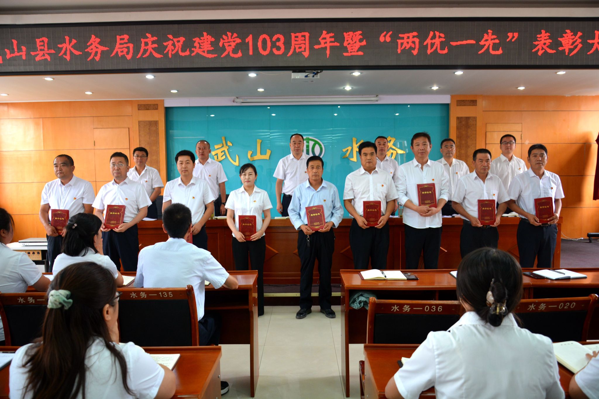7月1日上午,武山县水务局召开庆祝中国共产党成立103周年暨“两优一先”表彰大会。水务局党组书记、局长成小胜出席会议并讲党课,局党组成员、副局长周晚明主持会议,局党组成员、副局长刘沨宣读表彰决定。水务局党员干部职工共计161人参加会议。