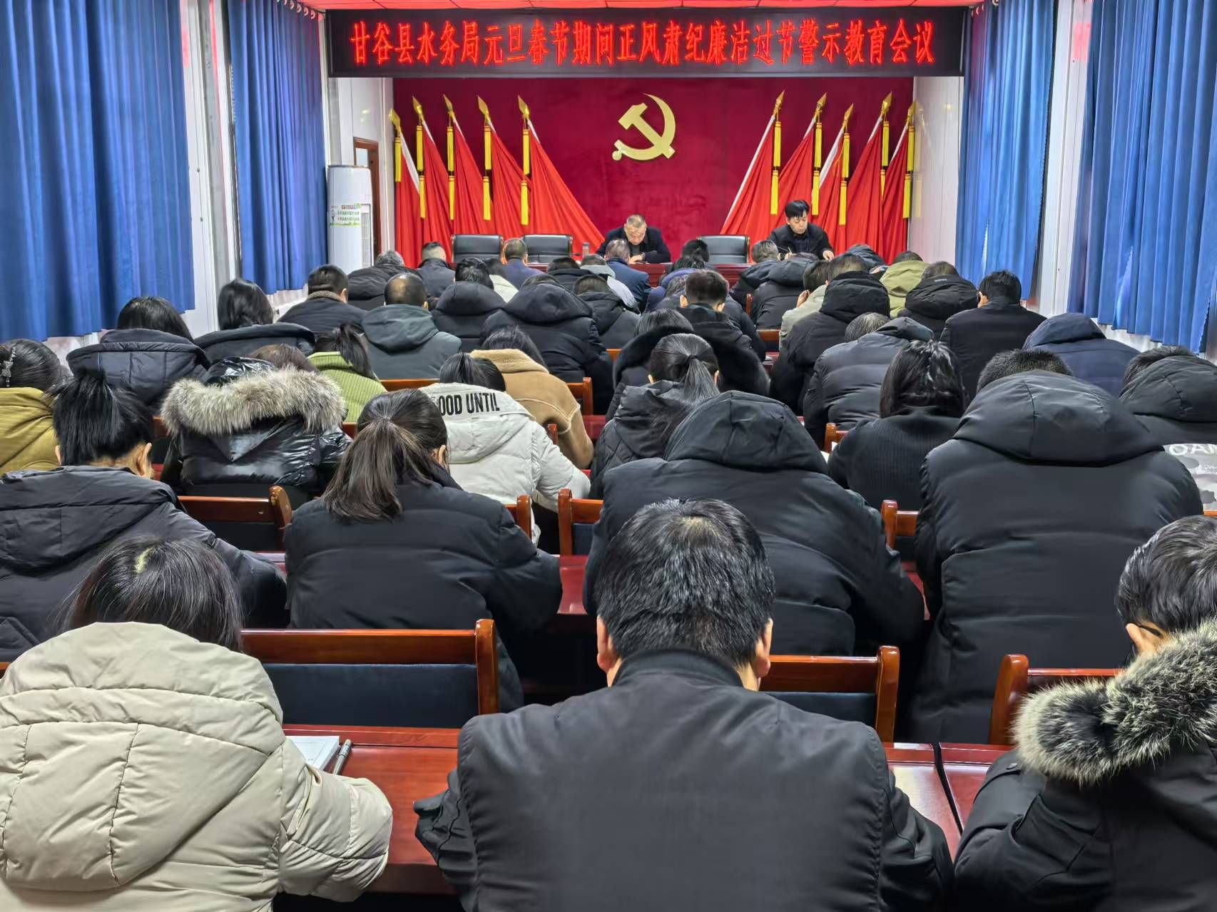 为深入贯彻落实习近平总书记关于作风建设的重要论述,近日,甘谷县水务局召开元旦春节期间正风肃纪廉洁过节警示教育会议,会议由局党组书记、局长张克义主持,局党组成员、科级领导干部、各供水站站长、机关全体干部职工共计60余人参加会议。