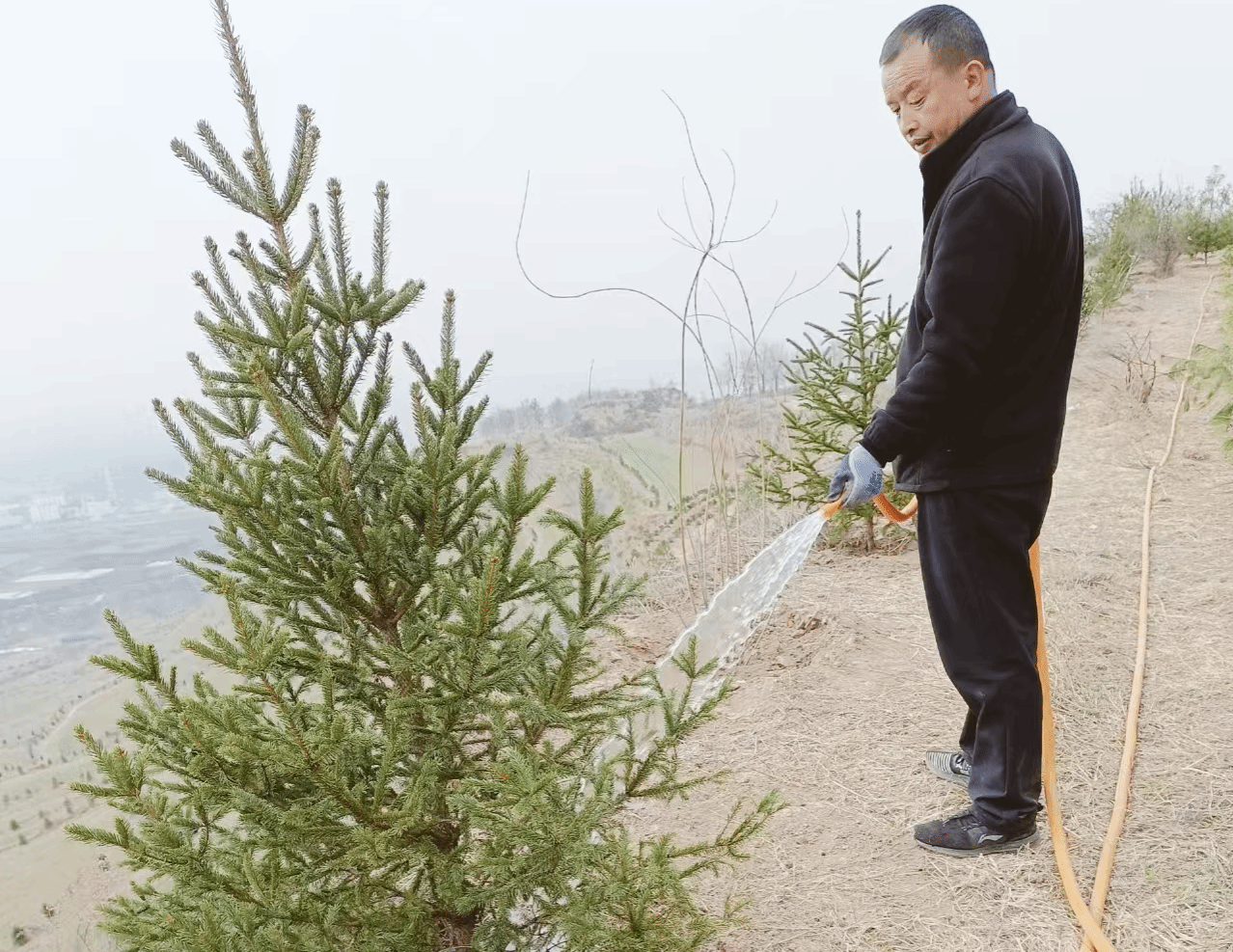 三分栽,七分管。近期县水务局按照“栽后即管、一管到底”原则,根据土壤墒情,再次组织干部职工对新栽植的176棵华山松、132棵云杉、131棵连翘实施精细化养护浇水。通过“早间透灌+傍晚补浇”双时段作业,并在浇水后及时松土封坑,减少水分蒸发,增加土壤透气性和渗透性,确保每株新苗根部充分吸水。至今年义务植树以来,累计出动人员110人次,先后3次浇水27吨,为树木成活筑牢根基。