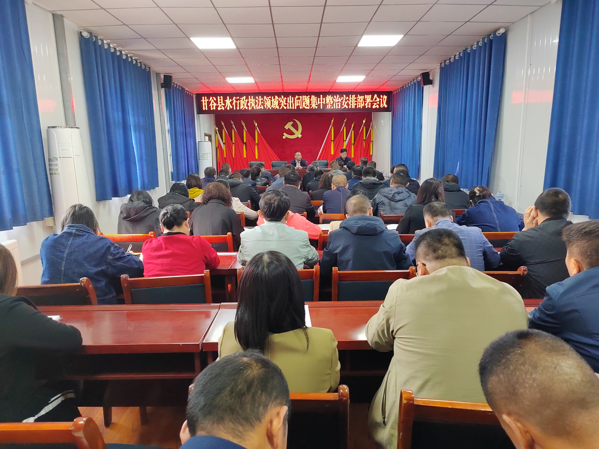 会上,传达学习了市水务局关于水行政执法领域突出问题集中整治的文件精神和工作要求,宣读了《甘谷县水行政执法领域突出问题集中整治工作方案》,就集中整治工作进行了全面安排部署。