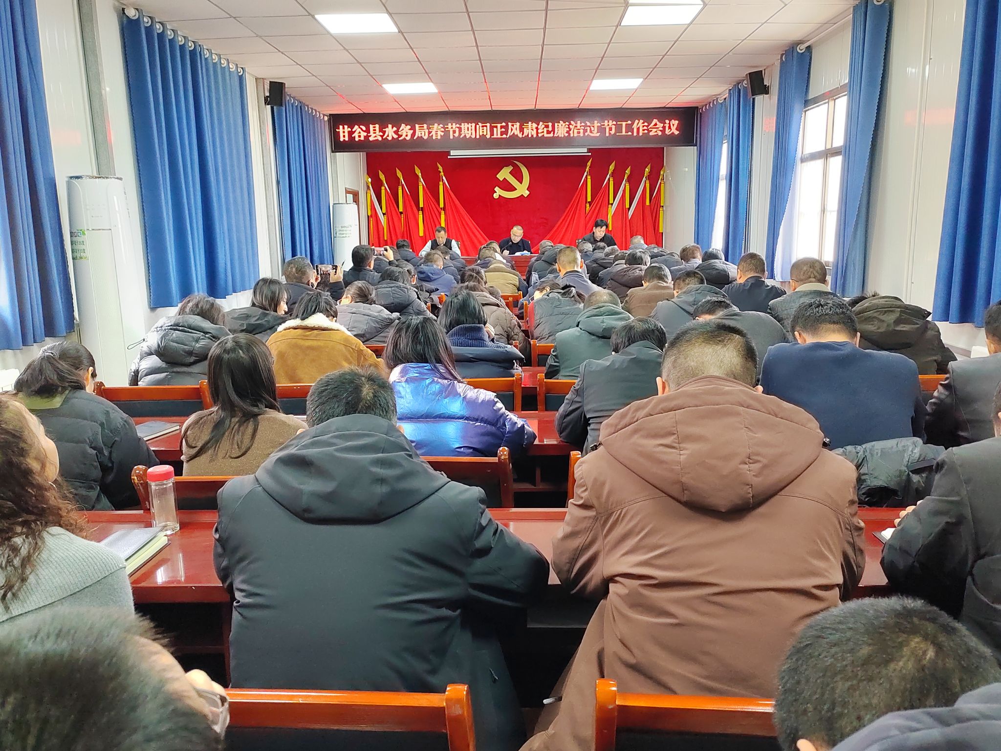 新春佳节将至,为持续加固中央八项规定精神,切实营造风清气正、文明节俭的节日氛围,近日,甘谷县水务局召开春节期间正风肃纪廉洁过节工作会议。会议由党组书记、局长张克义主持,局党组成员、科级领导干部、各供水站站长、机关全体干部职工60余人参加会议。