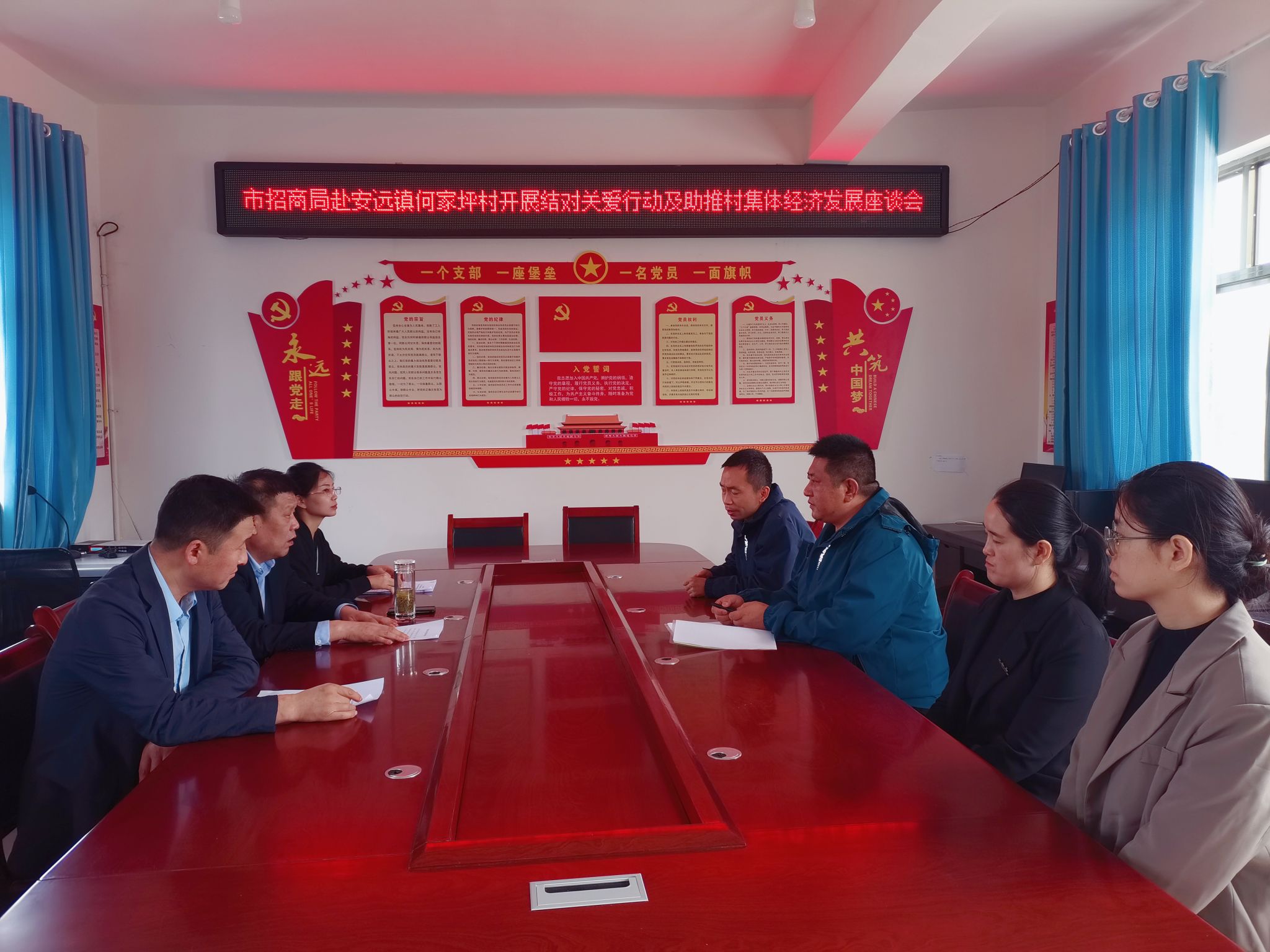 在安远镇何家坪村,组织驻村工作队、村“两委班子”和群众代表召开座谈会,听取驻村帮扶工作情况汇报,详细了解了村上主导产业及集体经济发展、防返贫动态监测、矛盾纠纷排查化解、人居环境整治等情况,研究助推村集体经济发展的工作举措。就进一步做好驻村帮扶工作,会议要求,要严守纪律规矩,遵守驻村各项规定,全力协助村“两委”开展好各项工作,在为帮扶村谋发展、为群众办实事上出实招、下功夫,切实提升驻村帮扶工作质量;要紧盯工作落实,吃透吃准政策,摸清村情民情,精准查找短板,理清发展思路,统筹做好防返贫动态监测、增产增收、产业发展、乡村建设和乡村治理等重点工作,高效推进乡村振兴工作;要强化产业赋能,聚焦何家坪村苹果、花椒、辣椒等具有鲜明本土特色的支柱产业,充分发挥招商部门与各地商协会、企业联系比较紧密的优势,积极对接各地商协会、企业开展消费助农活动,持续推动村集体经济高质量发展;要聚焦特殊困难群体的“急难愁盼”问题,对症下药、综合施治,进一步落实落细帮扶措施,团结带领帮扶村走高质量发展之路。