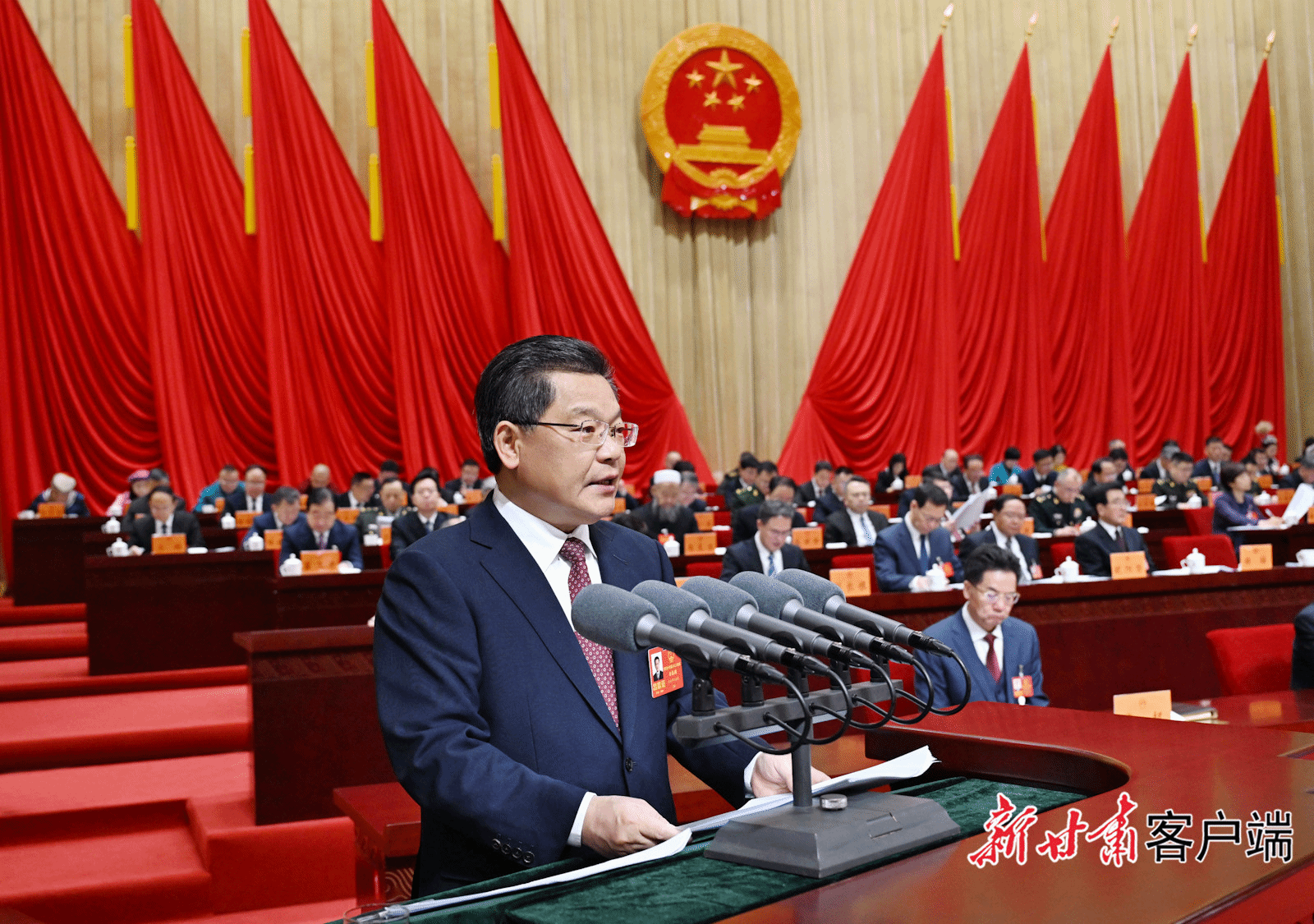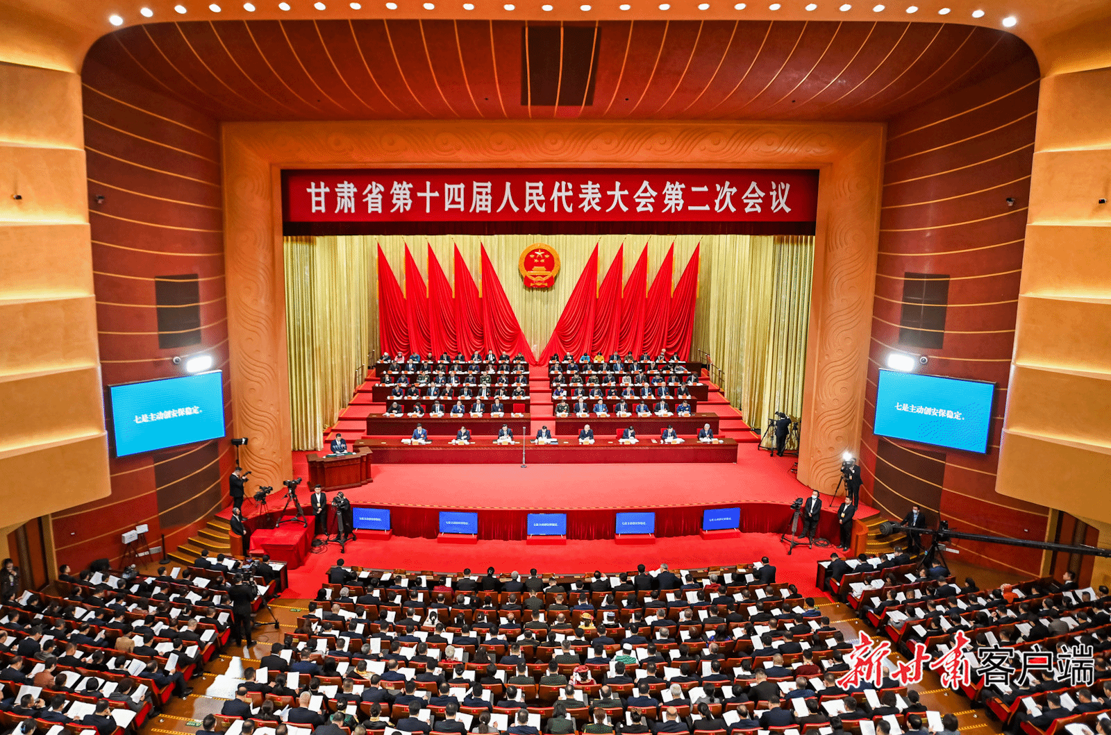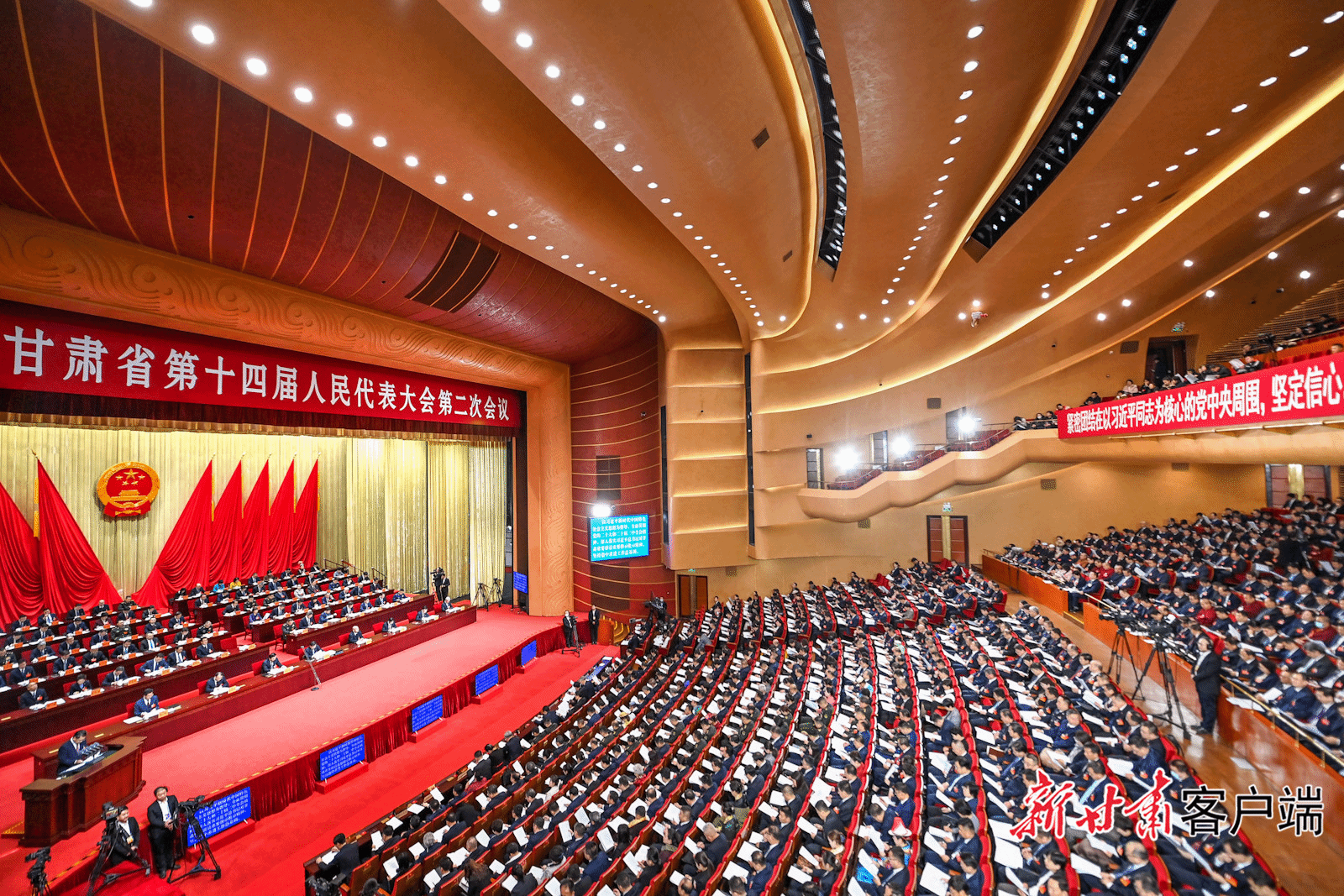 会场庄严简朴,气氛庄重热烈。大会主席台帷幕正中的国徽在鲜艳的红旗映衬下熠熠生辉。二楼眺台上高悬“紧密团结在以习近平同志为核心的党中央周围,坚定信心,开拓进取,奋力谱写中国式现代化甘肃实践新篇章!”的巨幅标语,鼓舞人心,催人奋进。
