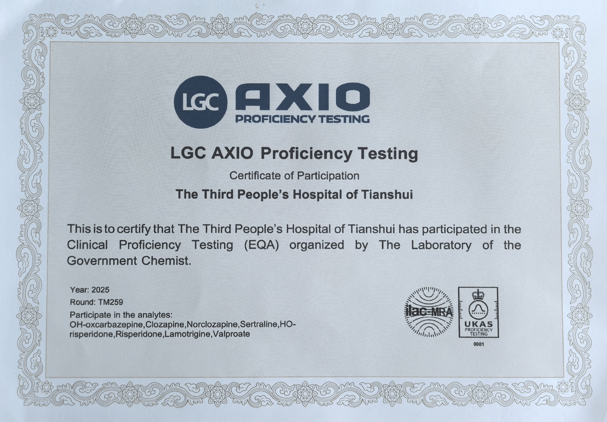LGC(英国政府化学家实验室)是全球公认的能力验证提供者,其组织的临床检验室间质量评价(EQA)是衡量实验室检测能力的“国际金标准”。作为三级甲等精神专科医院,天水市第三人民医院检验科始终致力于打造精准检验平台。为进一步满足临床需求,2025年8月新增了7种精神类药物的血药浓度检测,现已开展了20余种精神类药物的血药浓度检测,同时将新增项目及时纳入能力验证评价中,确保每一项检测结果的准确性。