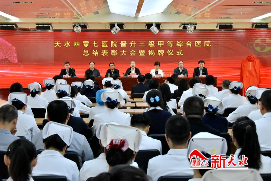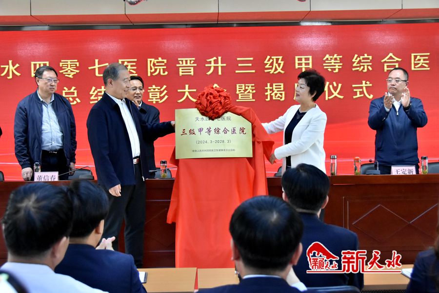 4月19日上午,天水四零七医院晋升三级甲等综合医院总结表彰大会暨揭牌仪式举行。省医药健康产业发展协会会长李存文、副市长汪小娟出席揭牌仪式,并共同为“天水四零七医院三级甲等综合医院”揭牌。省医药健康产业发展协会特聘专家苏秦川出席。