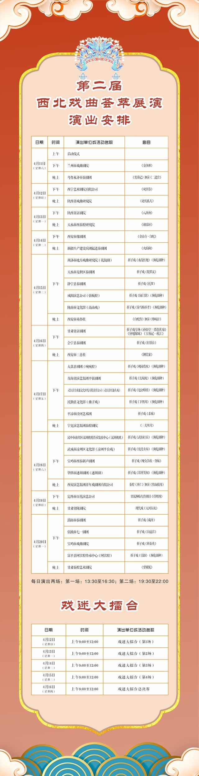 本次活动由中国戏曲表演学会、甘肃省文化和旅游厅、天水市人民政府联合主办,陕西省文化和旅游厅、宁夏回族自治区文化和旅游厅、青海省文化和旅游厅、新疆维吾尔自治区文化和旅游厅、新疆生产建设兵团文化体育广电和旅游局为支持单位,甘肃演艺集团、中共天水市委宣传部、天水市文化和旅游局、天水市秦州区人民政府承办。本次展演活动将汇聚西北五省区及新疆生产建设兵团35个戏曲院团,涵盖秦腔、陇剧、京剧、豫剧、花鼓剧、汉调桄桄、阿宫腔、弦板腔、高山戏、碗碗腔、曲子戏、凉州半台戏、灯盏头戏、迷胡剧等15个戏曲剧种,堪称西北戏曲艺术的一次全景式盛宴。