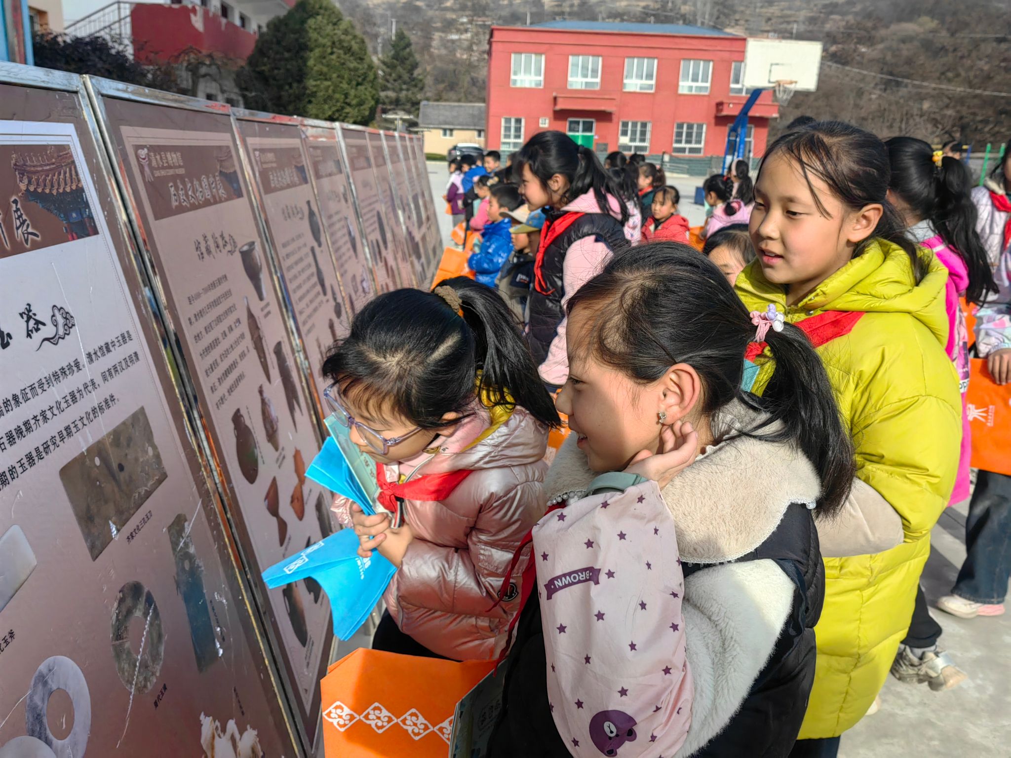 此次流动展览紧扣党的二十届四中全会精神要领,聚焦家乡历史印记,通过设计精美的图文展板、宣传折页,将抽象的文化知识转化为直观可感的视觉盛宴。展览现场,讲解员用通俗易懂的语言,结合山区孩子的生活认知,生动讲述文物背后的故事以及历史发展脉络。孩子们驻足在展板前认真聆听,不时举手提问,在互动问答环节各抒己见,沉浸式感受中华传统文化魅力。