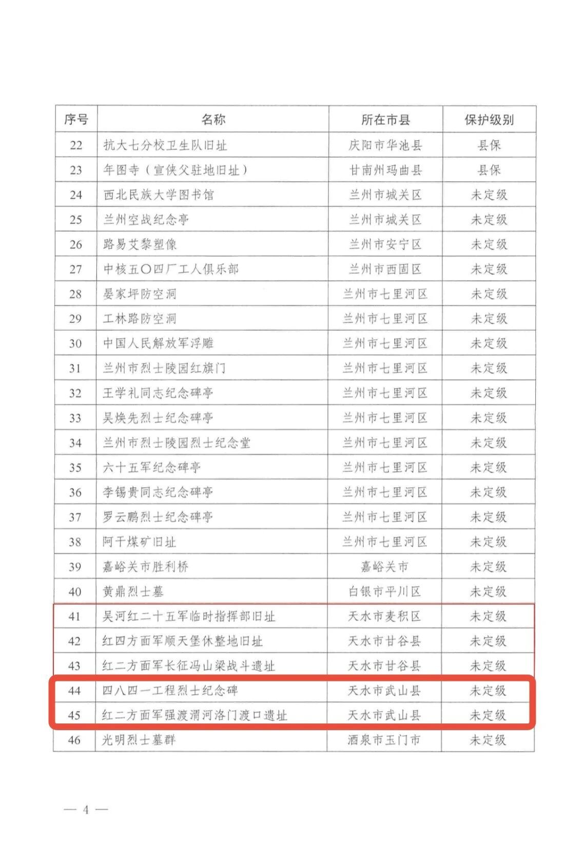 近日,甘肃省文物局公布第三批革命文物名录,我县结合第四次全国文物普查,组织开展遴选认定工作,经县文物保护研究中心遴选申报,专家审核研究,武山县两处文物:四八四一工程烈士纪念碑、红二方面军强渡渭河洛门渡口遗址成功入选甘肃省第三批革命文物名录。