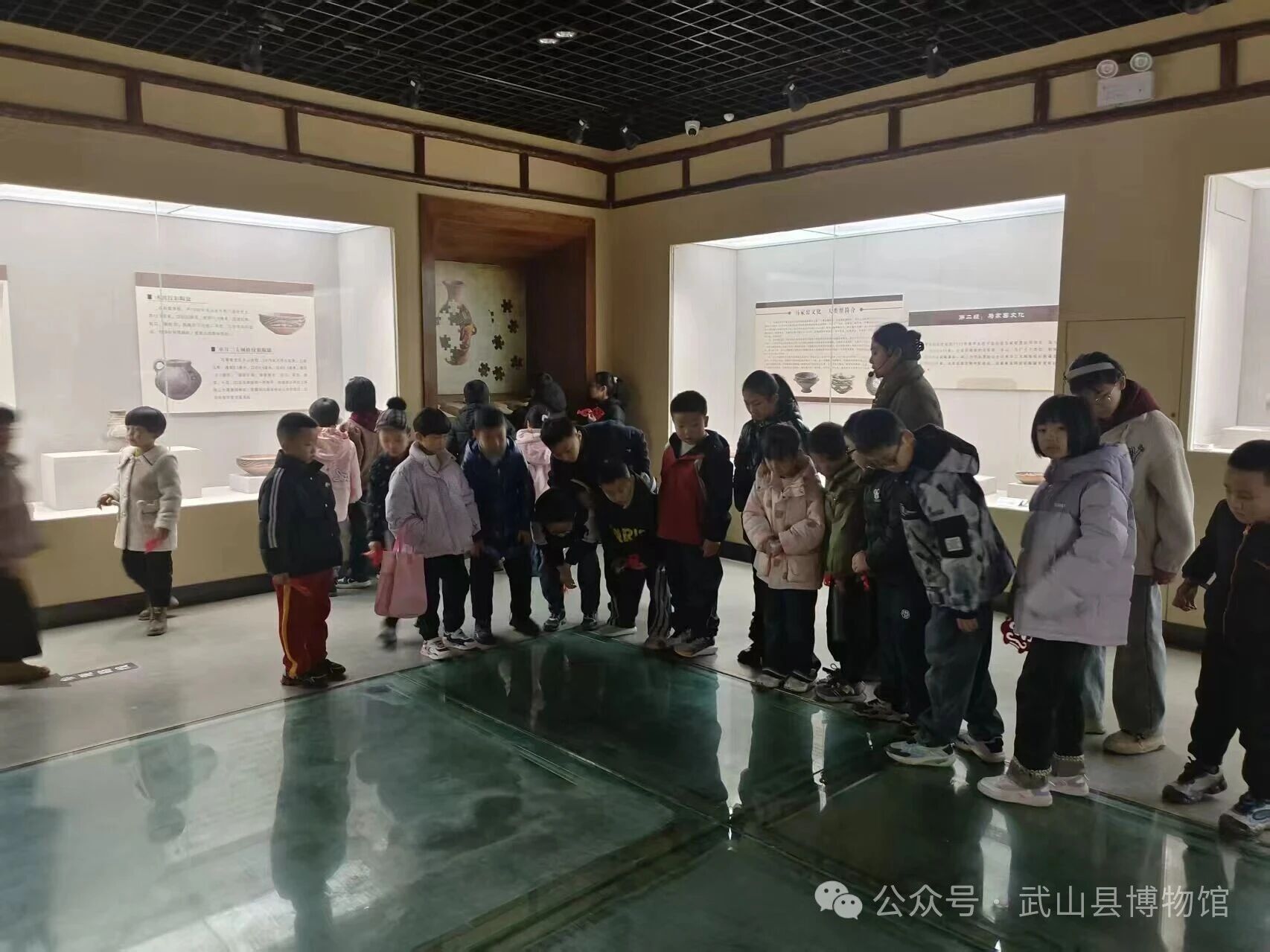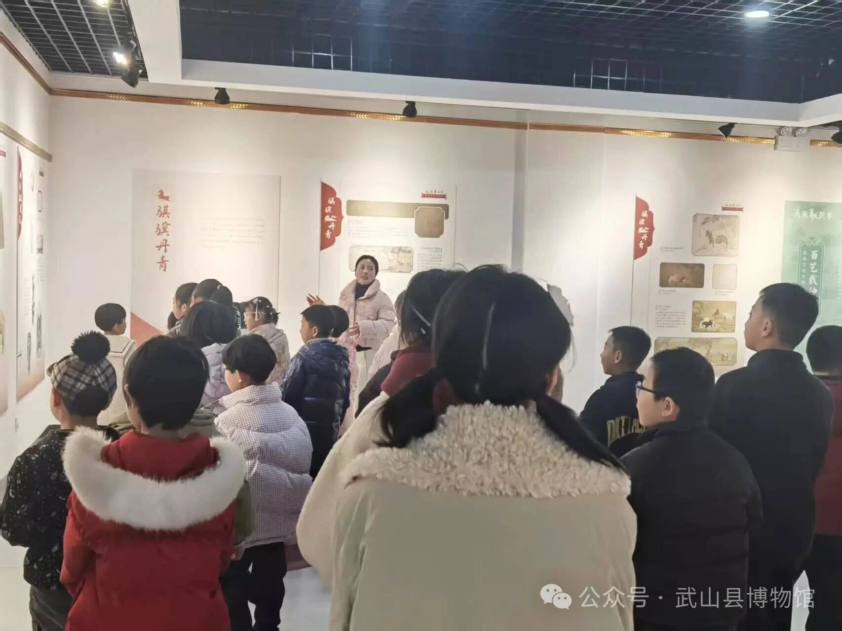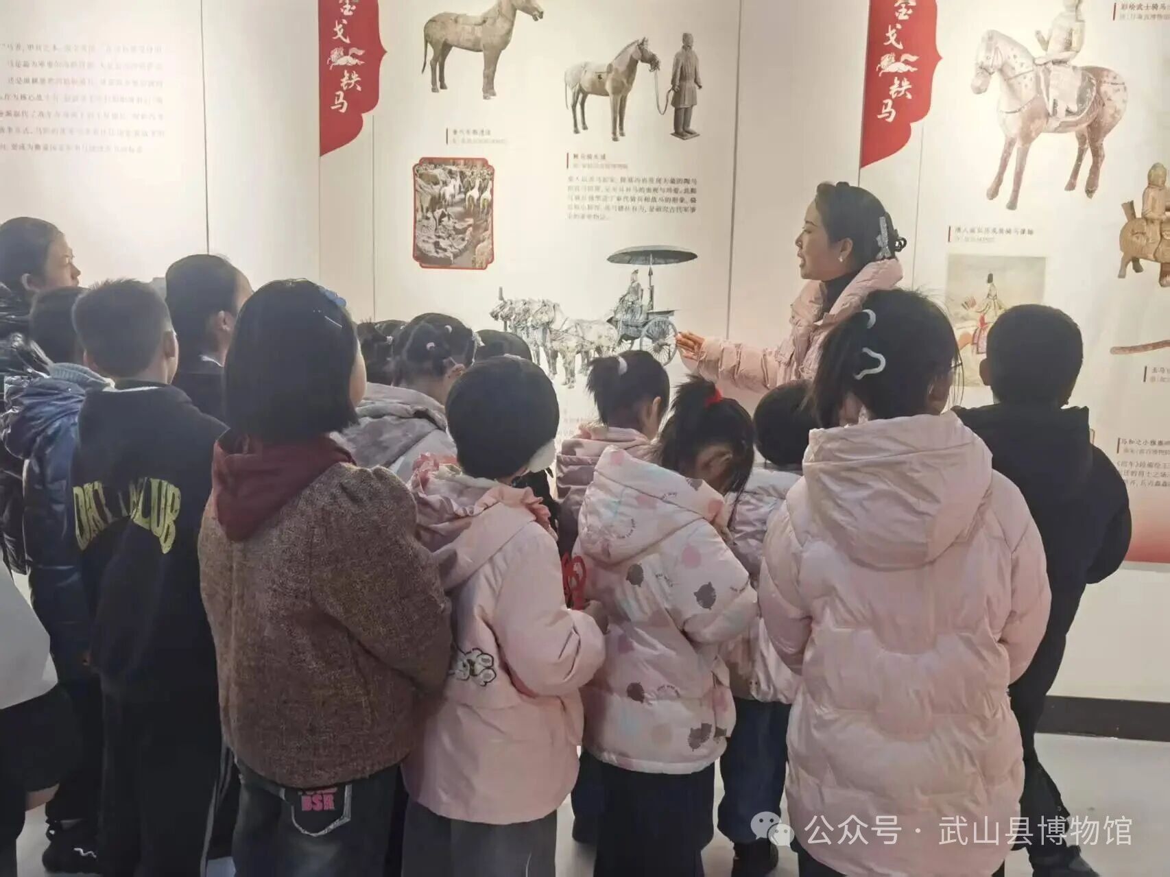 随后,大家在李老师的带领下走进“马舞新春 ·丙午马年生肖文化大联展”临时展厅中参观学习、交流互动。从“千里马”的典故到“马到成功”“龙马精神”的吉祥寓意,从古代绘画、雕塑中的马形象到剪纸艺术里的简洁表达,图文并茂的讲解让孩子们听得津津有味。