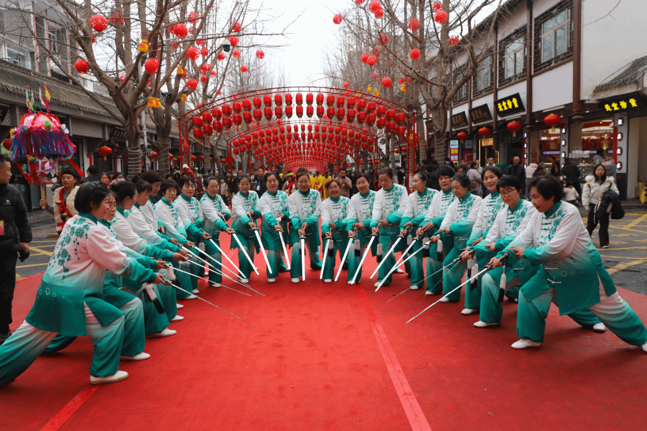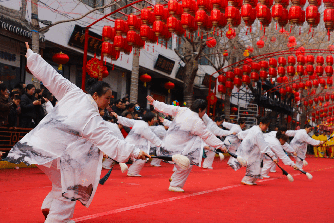 展演现场,国家级非遗武山旋鼓舞气势磅礴,鼓手挥扇鼓、踏节拍,旋转腾挪间鼓声铿锵、环佩齐鸣,“二龙戏珠”“太子游四门”等传统套路刚健洒脱,尽显千年民俗的雄浑气魄。武山高烨流光溢彩,竹篾骨架、彩绸飘带与影灯辉映,舞者执灯旋舞、动作灵动,队列谐和,兼具祈福寓意与视觉美感,尽显民俗非遗的精美与独特魅力。太极剑、太极毛笔刚柔并济,尽显太极拳风骨神韵,舒展沉稳、气韵流转,彰显出中国传统武术的独具魅力。