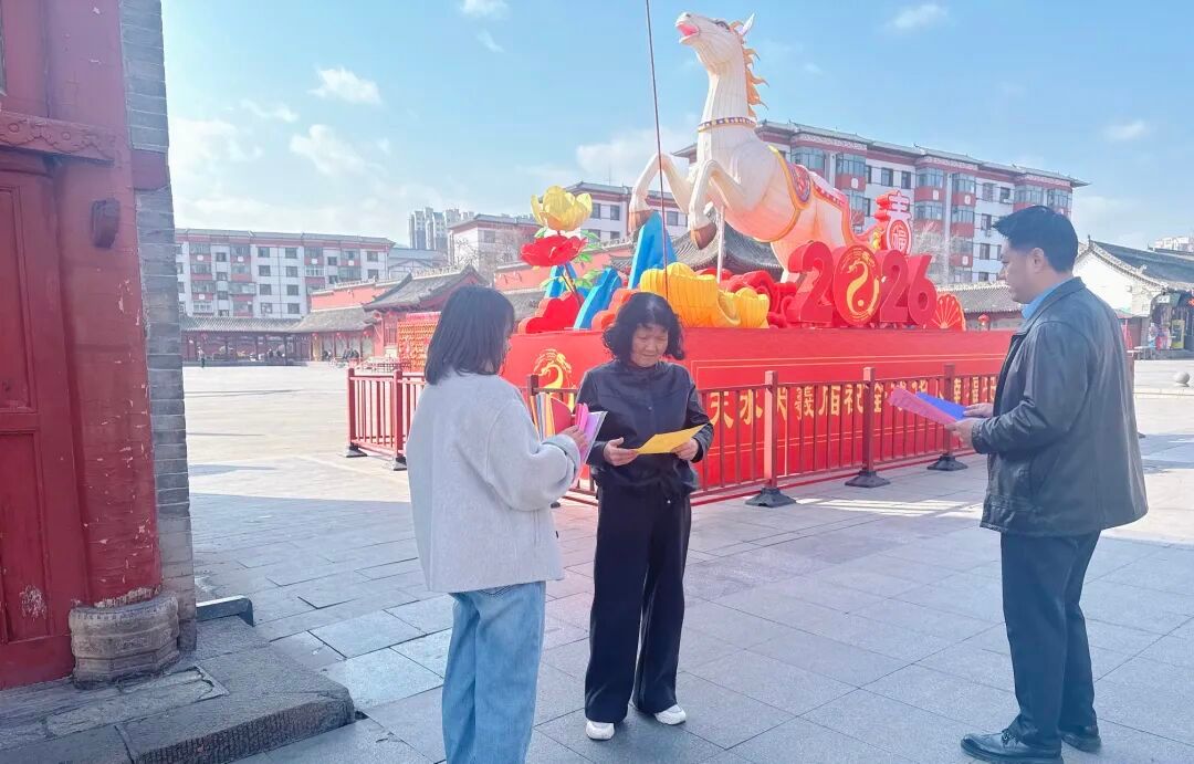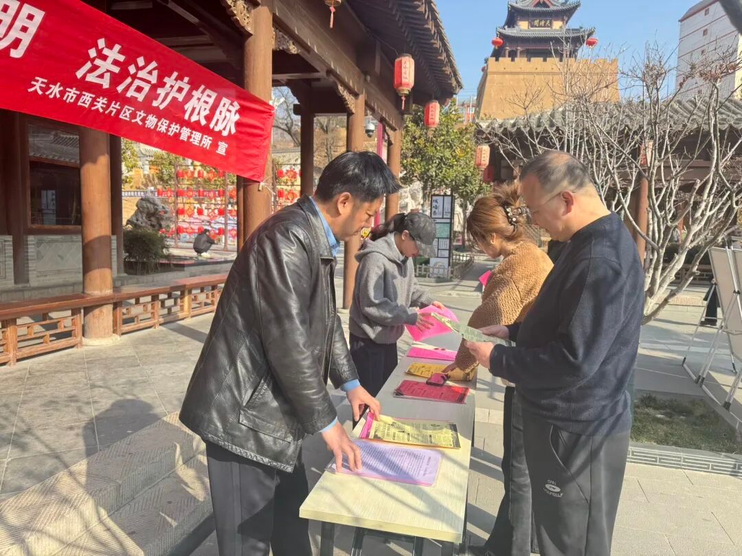 为持之以恒推进新修订《中华人民共和国文物保护法》宣传普及,在该法正式施行一周年之际,秦州区文旅局深入天水古城、伏羲庙广场、部分乡镇、街道开展主题为“文物昭文明,法治护根脉”的普法宣传活动。