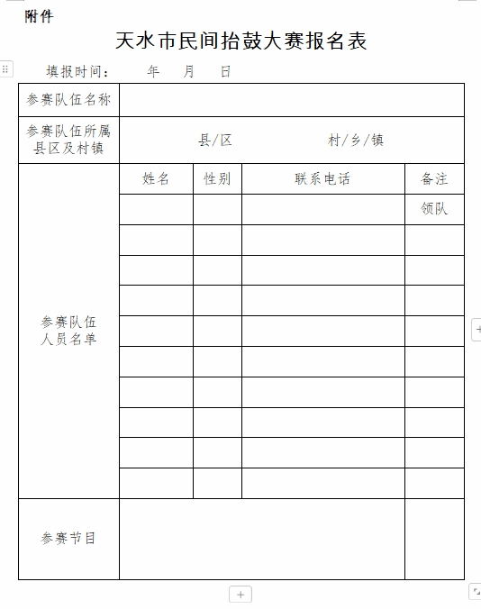 附件:天水市民间抬鼓大赛报名表