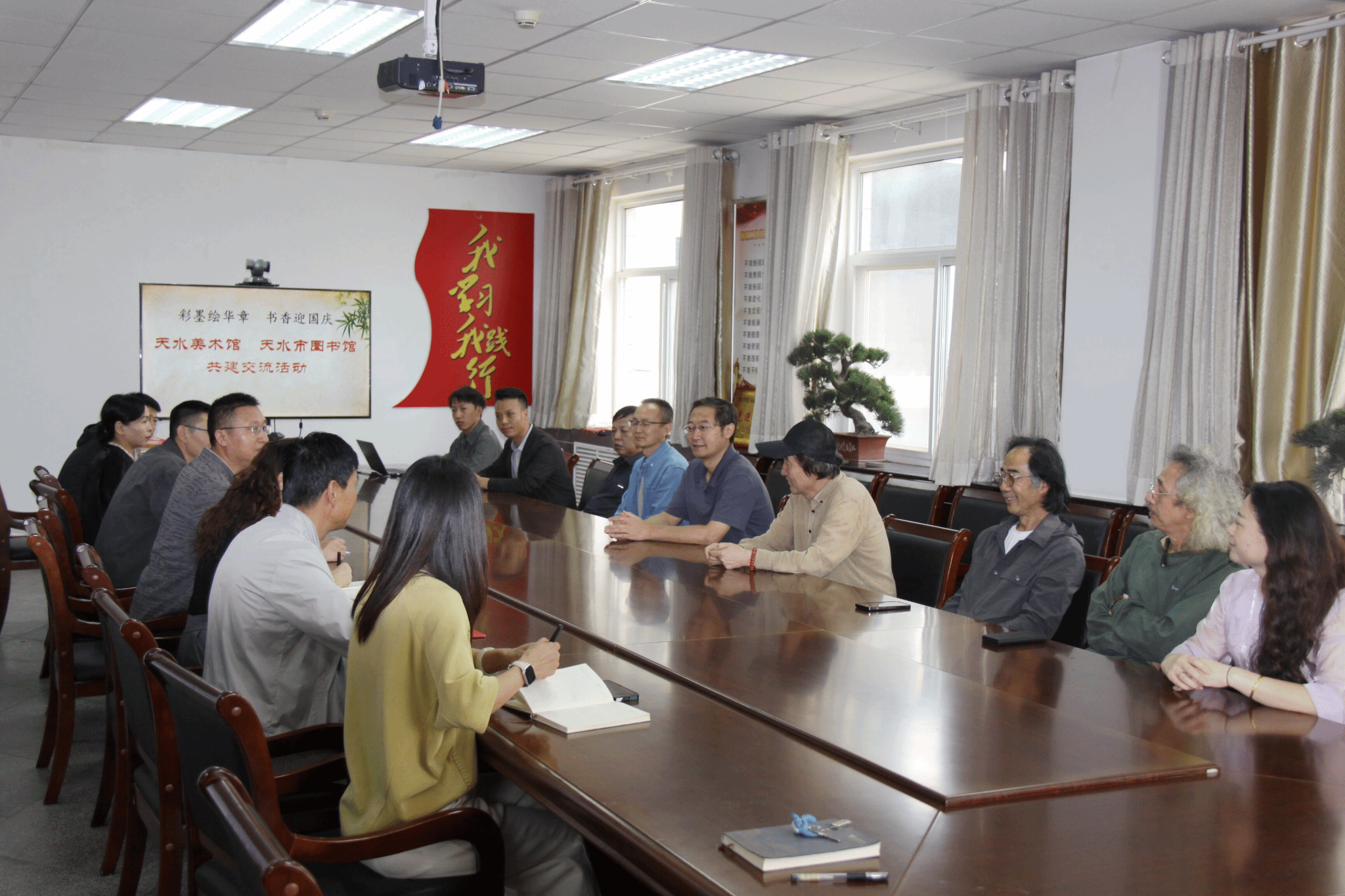 随后由两馆党支部组织、由天水美术馆馆长李靖领学了习近平总书记视察甘肃的重要讲话和指示精神。李靖馆长介绍了市美术馆的历史沿革和发展情况,对于两馆今后在公益讲座、业务交流等方面的长期合作寄予美好期待。市图书馆馆长周涛简要介绍了我馆近年来在古籍保护、全民阅读、数字化建设等方面的工作开展情况,对于市美术馆各位书画家的莅临表示欢迎,希望两馆能够以此次共建交流活动为契机,构建在文化领域的常态化合作,用自身艺术特长支持我馆公益性活动的开展,为公众提供更多机会走近艺术、了解艺术,使市图书馆能够更好发挥市民精神文化阵地作用。