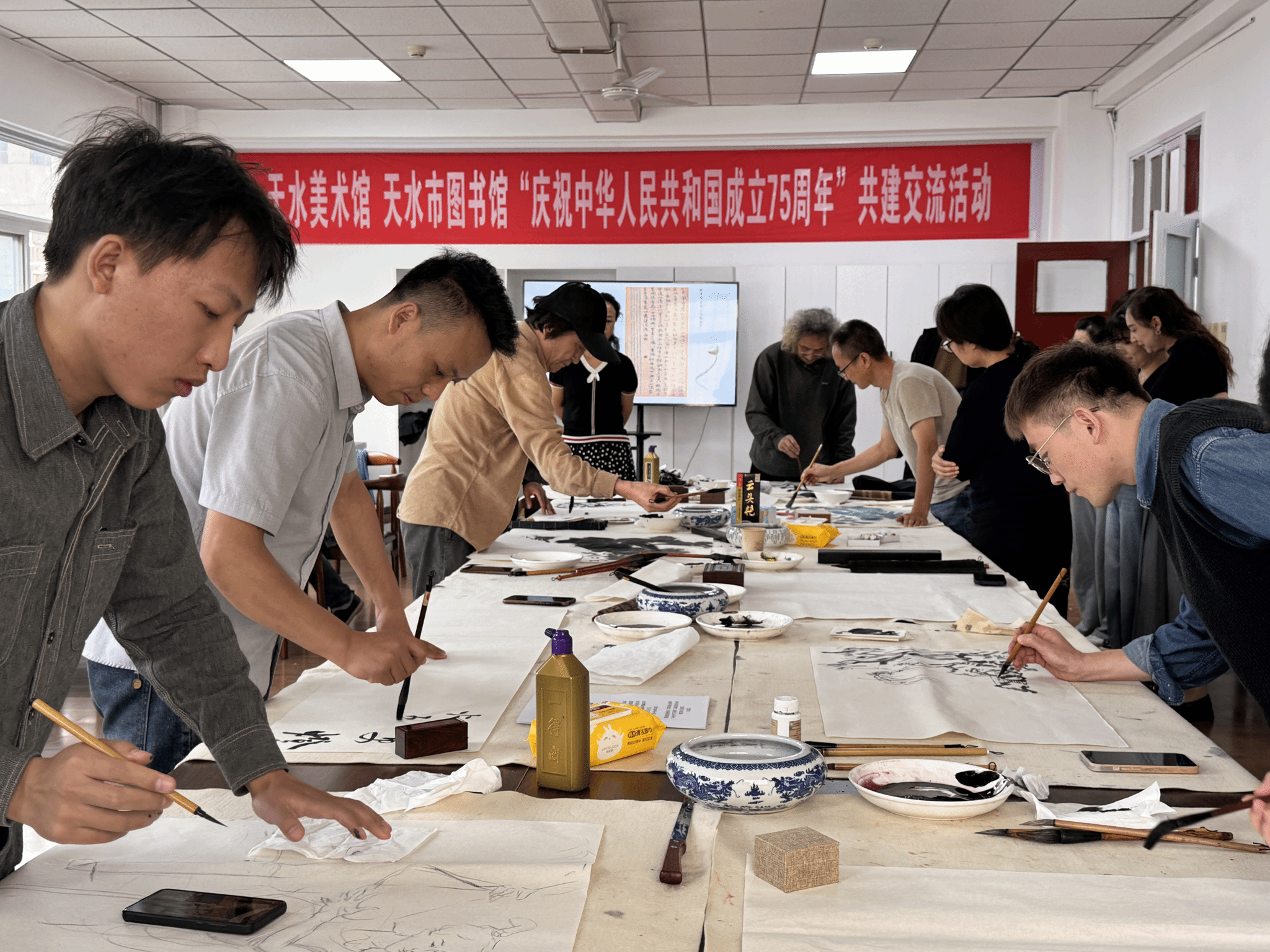 为庆祝中华人民共和国成立75周年,深入贯彻落实习近平总书记视察甘肃重要讲话精神,用艺术的形式弘扬时代主旋律,用书香的力量传承优秀传统文化,9月27日,在国庆节来临前夕,天水市图书馆邀请天水美术馆书画家走进图书馆,举办“彩墨绘华章 书香迎国庆——天水美术馆 天水市图书馆‘庆祝中华人民共和国成立75周年’共建交流活动”。