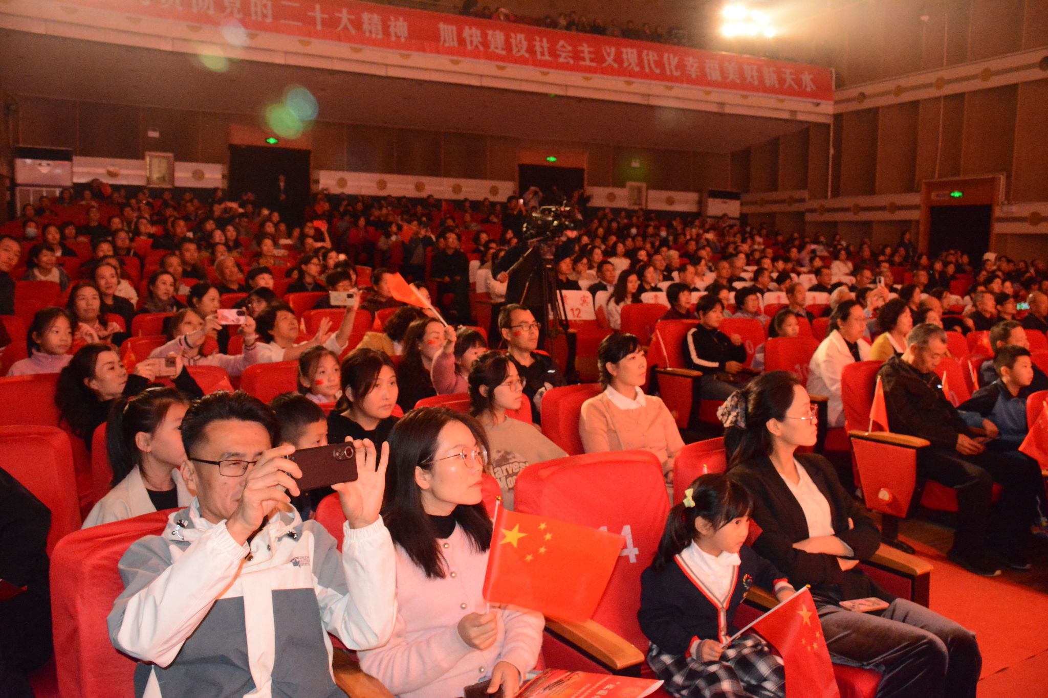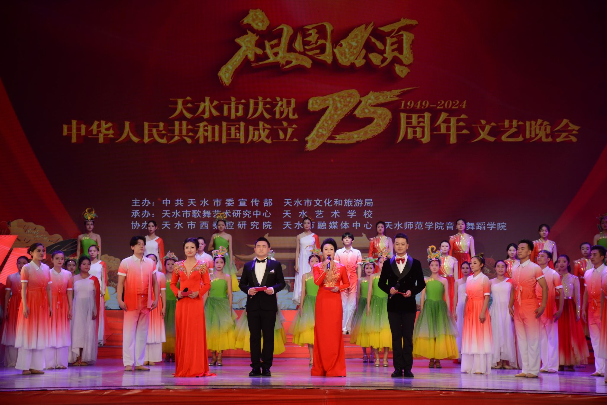 辉煌七十五载,礼赞盛世华章。9月29日晚,由中共天水市委宣传部、天水市文化和旅游局主办,天水市歌舞艺术研究中心、天水艺术学校承办的“祖国颂”天水市庆祝中华人民共和国成立75周年文艺晚会在秦州大剧院成功举办,向全市人民献上了一场激动人心的文化视听盛宴,为祖国母亲献上最诚挚的生日祝福。市领导王文东、沈建玲、董小平、郭庆祥、吴立新等与700余市民一同观看了演出。
