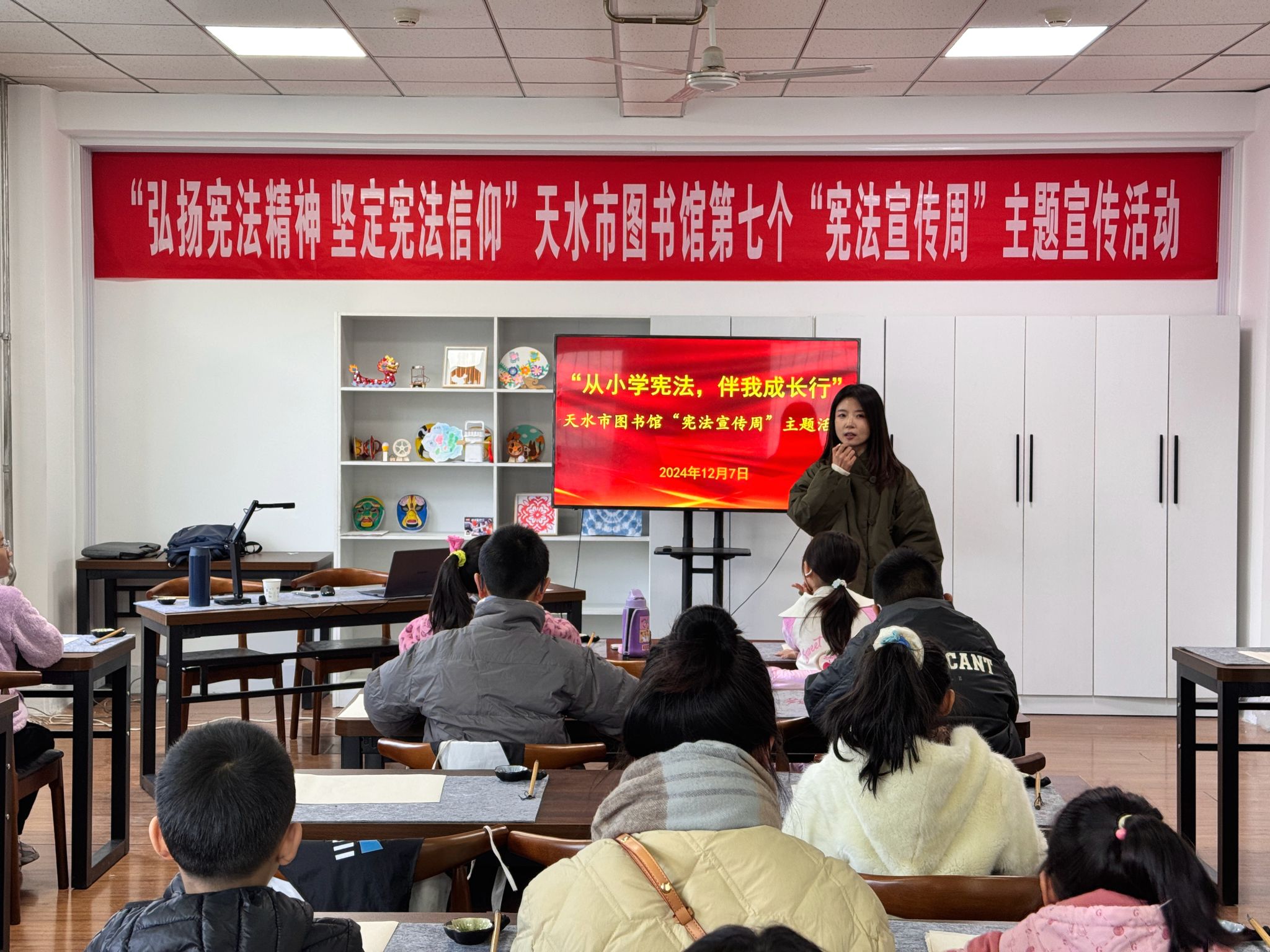 为引领广大民众深入学习宪法、由衷尊崇宪法、切实践行宪法并传承宪法精神,大力推动宪法精神的弘扬,积极构建社会主义法治文化,12月7日,天水市图书馆举办“从小学宪法,伴我成长行”宪法宣传周主题活动。来自市内30名少儿参加了此次活动,活动旨在广大少年儿童增强宪法意识,提升法治素养,为法治社会的建设培育新生力量。