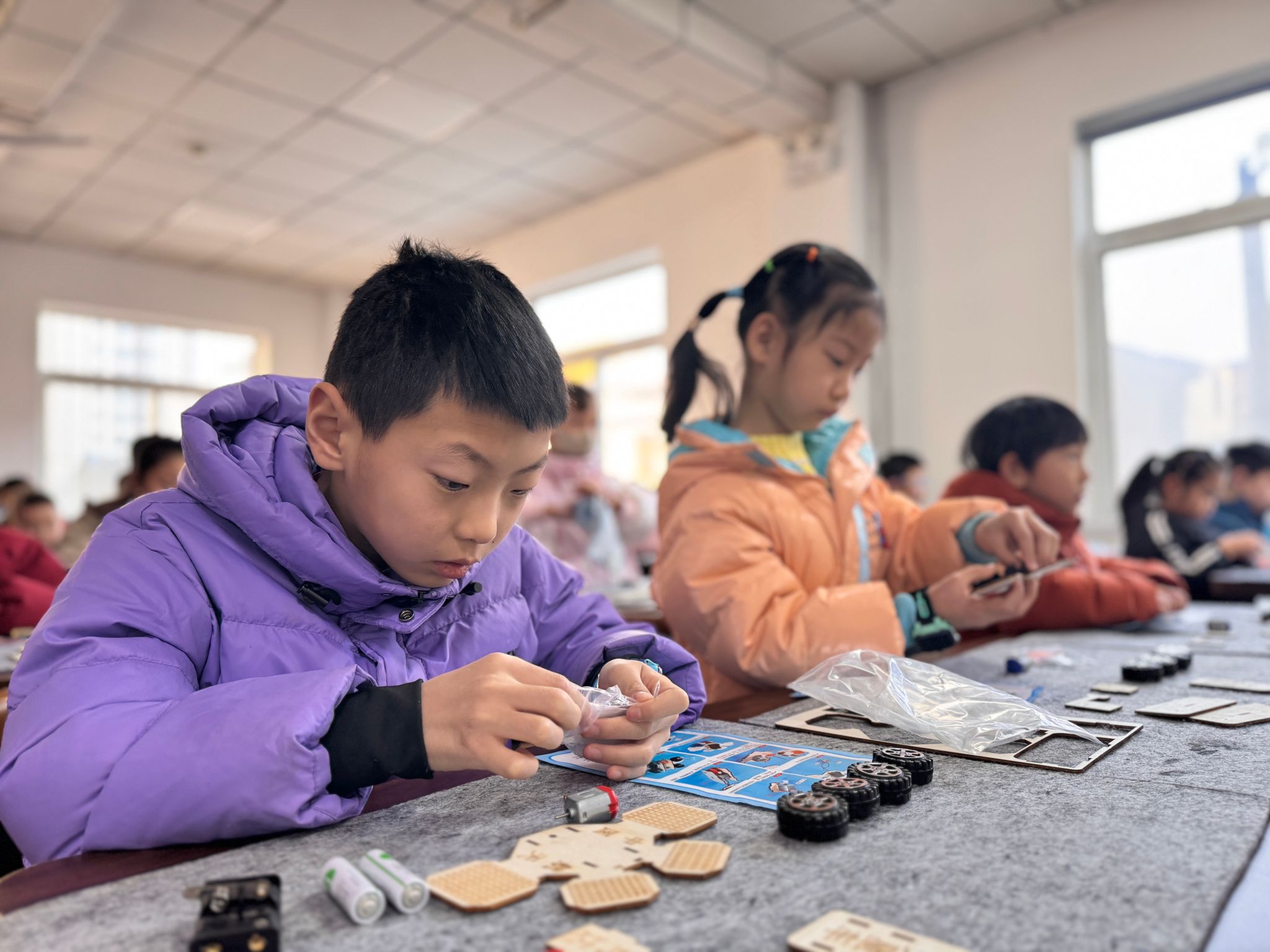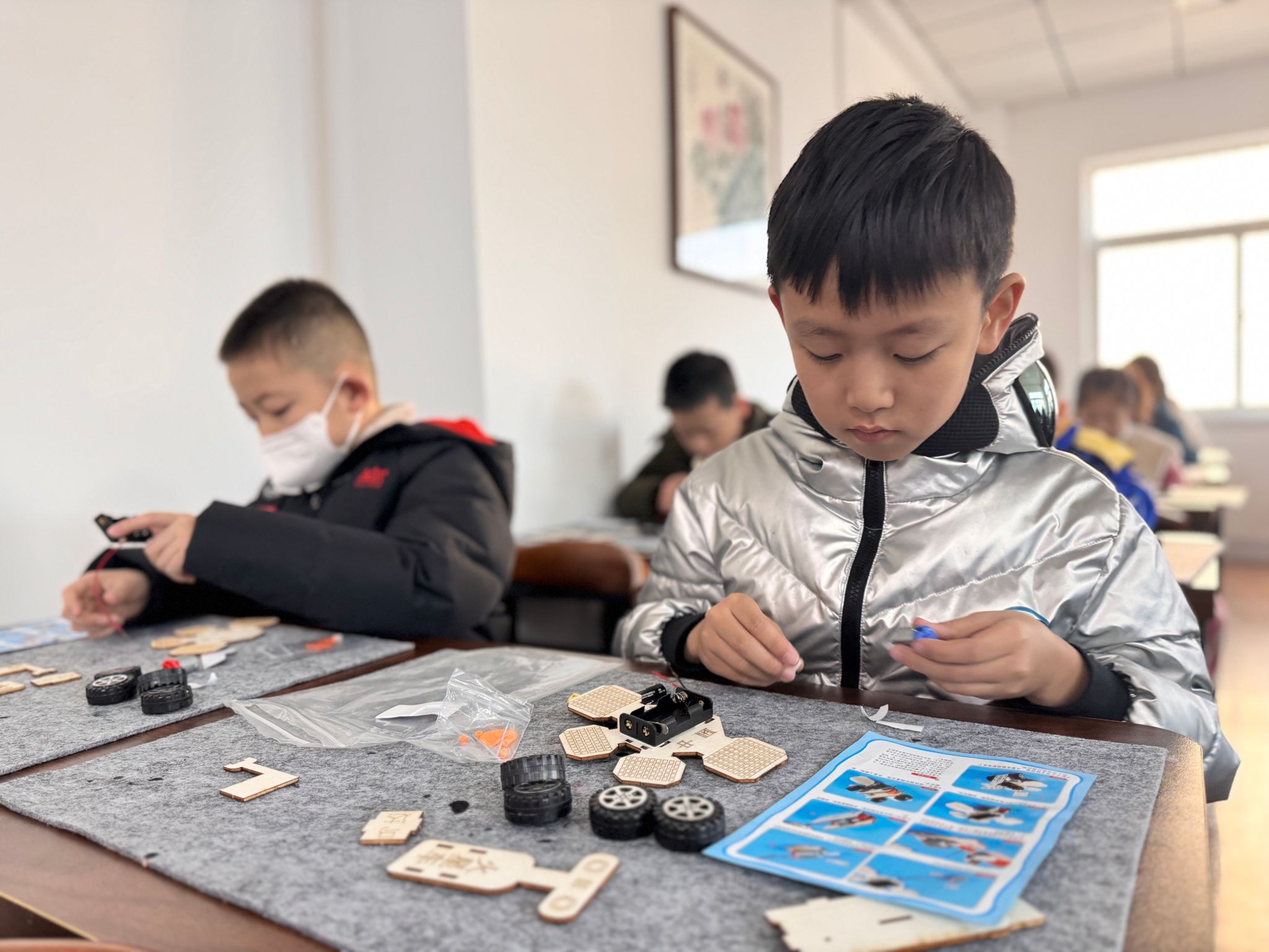 手工制作环节,孩子们在现场志愿者及工作人员的指导下开始动手组装火星车。他们学习了如何连接电机和电池盒,如何安装轮子,如何用螺丝和螺母固定各个部件。这个过程中,孩子们也遇到一些小挑战,但这也锻炼了他们解决问题的能力。组装完成后,孩子们相互展示自己组装的作品。在活动最后,大家纷纷拍照留念。