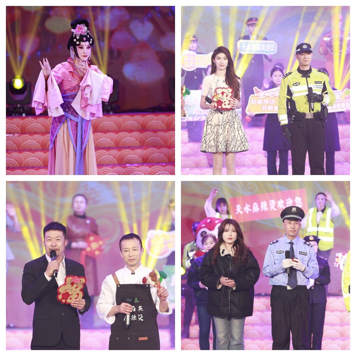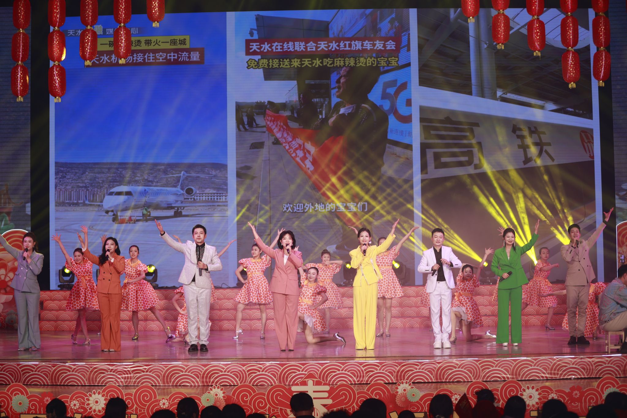 整场晚会以“东方微笑跨越千年·热辣天水点亮春天”为主题,市县联动、内容丰富、形式新颖多样,融合了地方优秀传统特色文化,弘扬了时代主旋律。晚会在欢快喜庆的开场舞蹈《锦绣天水万里春》中拉开帷幕。歌曲《好运全都来》《幸福飞起来》《点赞新时代》唱出了天水人民对新春的美好祝愿和对伟大祖国的热爱,传递着新年的喜庆与祝福;秦安莲花战鼓、武山旋鼓、清水木人摔跤、轩辕鼓、张家川花儿等逐一登台,展现了天水非遗的独特魅力,舞出了天水人民的豪迈和喜悦;歌舞《热辣辣的天水麻辣辣的香》《在天水等你》《天水欢迎你》、小品《就在这里吃》展现了热辣天水的城市韵味和天水人民的热情好客,热辣滚烫的气氛将晚会推向高潮;情景歌舞《东方微笑》、歌曲《说伏羲》、舞蹈《水天一色》,让我们沿着总书记的脚步,再一次领略伏羲文化的博大精深,陇上江南的物阜民丰,唱出了麦积山石窟跨越千年的“东方微笑”,更唱出了人民群众发自内心的幸福;歌曲《天水新时代》唱出了我市昂扬向上的精神风貌和经济社会高质量发展的丰硕成果;秦腔《苏蕙观灯》将传统戏曲元素与现代舞台技术相结合,展现了天水古文化的博大精深,呈现出别具一格的视听效果;舞蹈《十里桃林春意暖》、歌舞《中华吉祥果》展现了天水在乡村振兴的征程上,做大做强特色产业,带动群众增收致富,把生活过得像“花牛苹果”一样红红火火。晚会演出近2小时,通过全体演职人员倾情演出,天水文旅推介官、网红大咖、“天水麻辣烫”表情包大叔等基层一线代表加盟,让现场观众既过了眼瘾又饱了耳福,掌声、欢呼声、喝彩声此起彼伏,一浪高过一浪。最后,晚会在歌舞《启航新征程》的激越高昂旋律中落下帷幕。